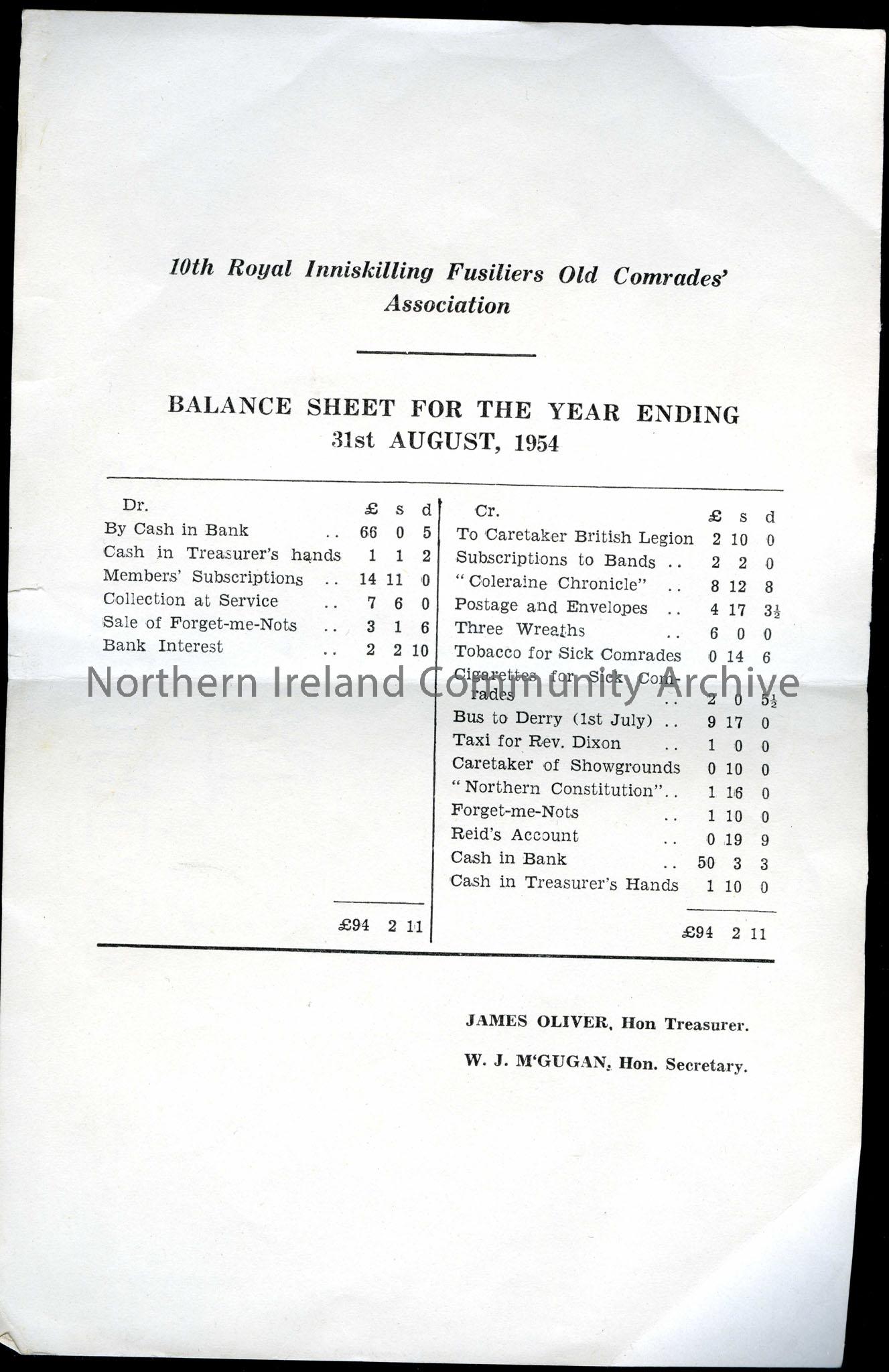 document entitled '10th Royal Inniskilling Fusiliers Old Comrades' Association' 'Balance Sheet for the Year Ending 31st August, 1954'. Lists one list of credits and one list of debits. Names James Oliver, Hon Treasurer and W. J. McGugan, Hon. Secretary.
