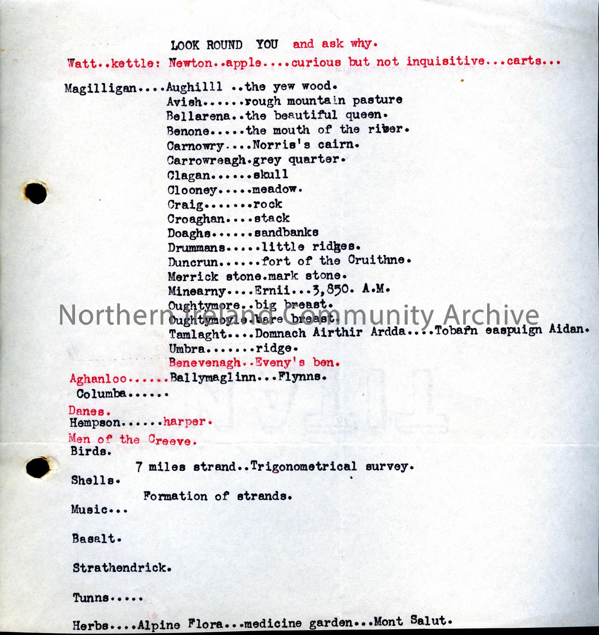 Document entitled “Look Around You”. It contains a list of place names and their meanings. There are various other headings like birds, shells, 7 mile…