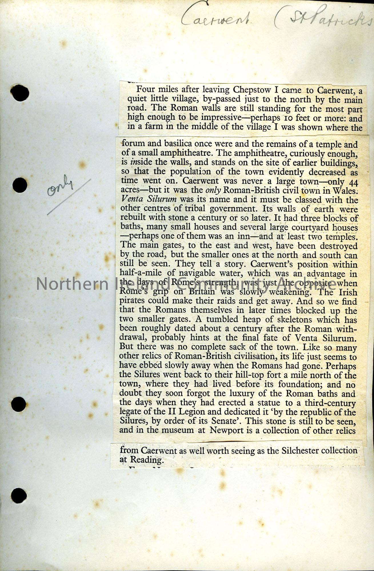 document re Caerwent town in Wales. Details Roman influence on its construction and a statue erected of the II Legion.