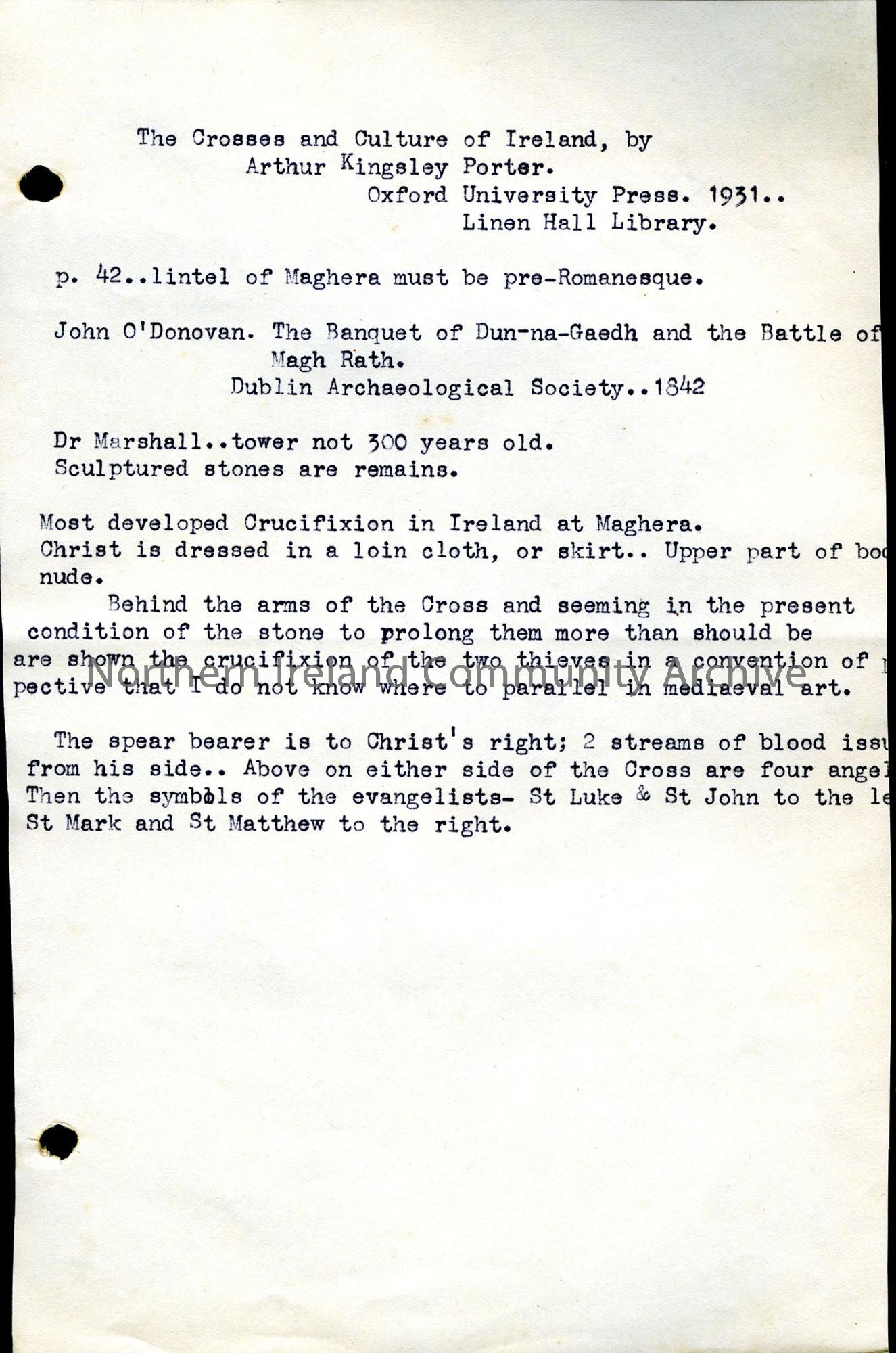 document titled 'The Crosses and Culture of Ireland, by Arthur Kingsley Porter, Oxford University Press, 1931, Linen Hall Library'. Mentions the lintel of Maghera, John O'Donovan The Banquet of Dun-na-Gaedh and the Battle of Magh Rath.
