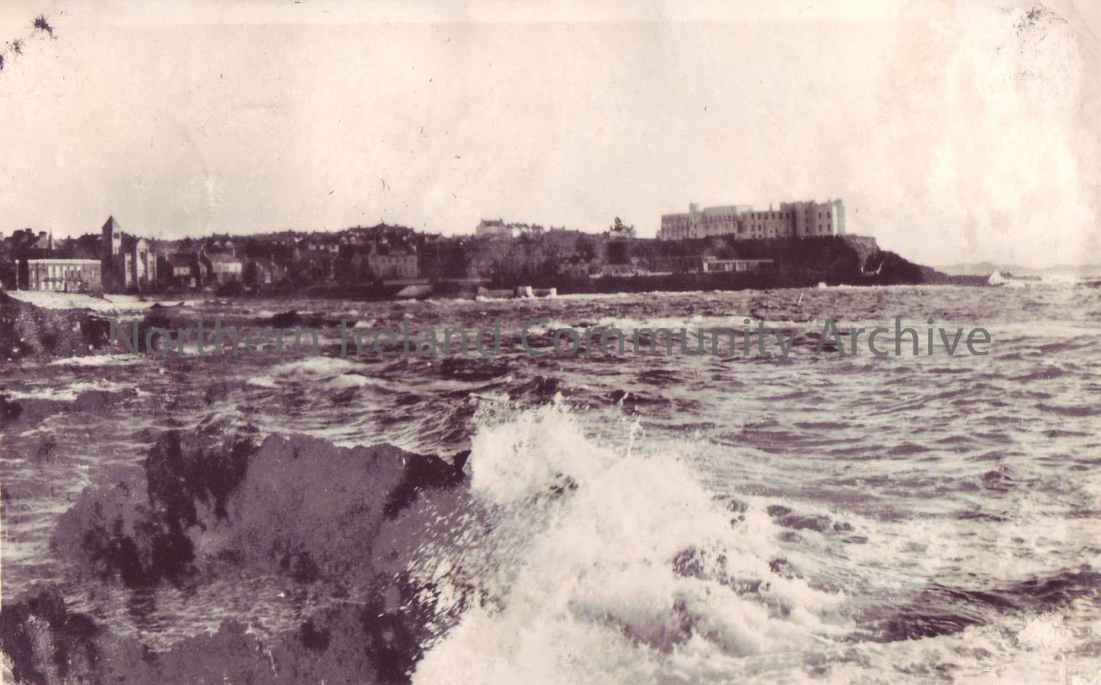 postcard depicting Dominican Convent Portstewart, with convent in background and sea with rocks in foreground.