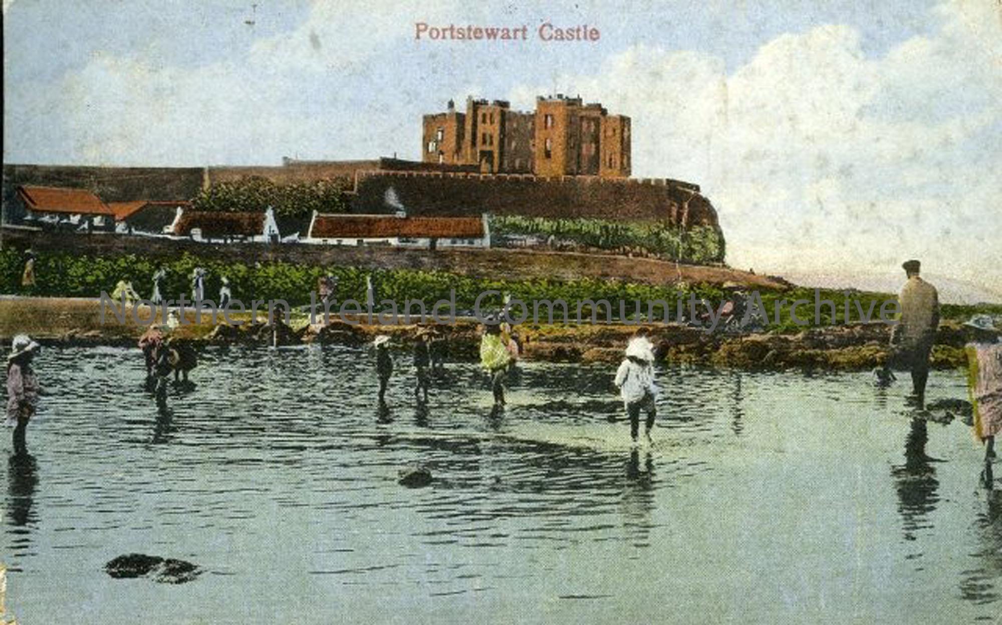 An image of the Portstewart Castle, and children playing in the sea below.
