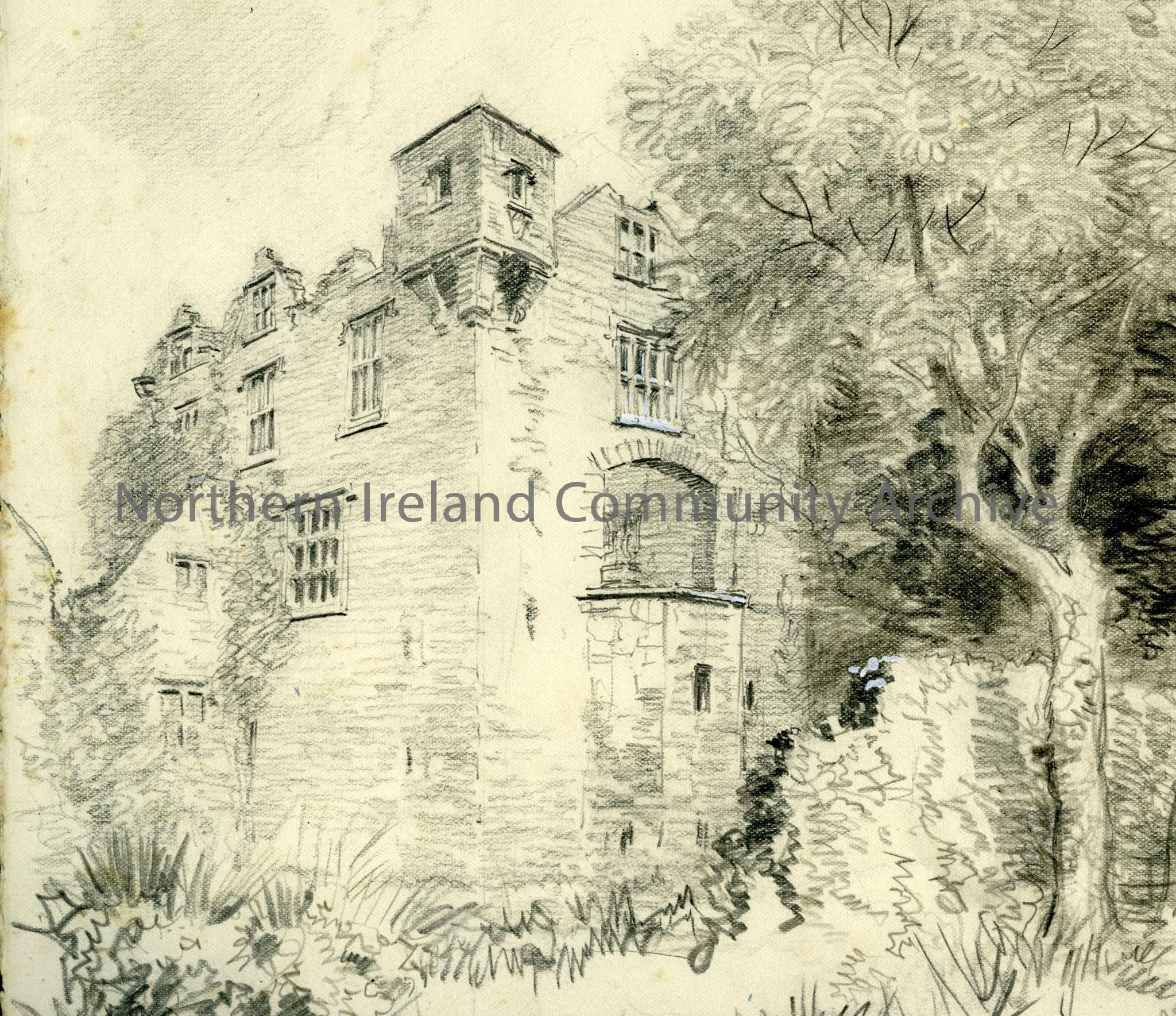 artwork titled, 'Donegal Castle' by Hugh Thomson for 'Highways and Byways in Donegal and Antrim' by Stephen Gwynn. Depicts castle, trees and field. Could possibly be for page 46 of book.