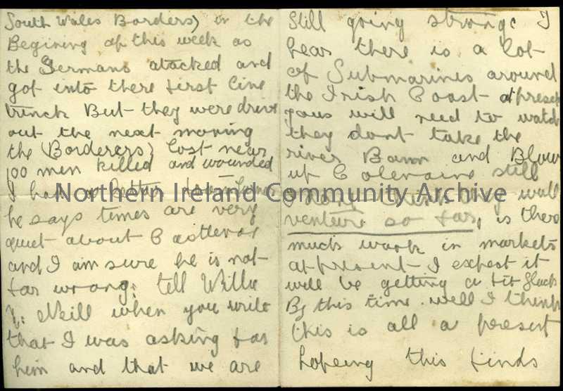 Double folded page of handwritten letter in pencil from James to his father. In trenches for past 6 days with the South Wales Borders, who lost 100 men (killed or wounded) Some description of fighting and hears submarines around coast of Ireland. Mentions William and Sandy (brothers), Willie McNeill, Tommie Turner, Robert Biggart (died at good age)