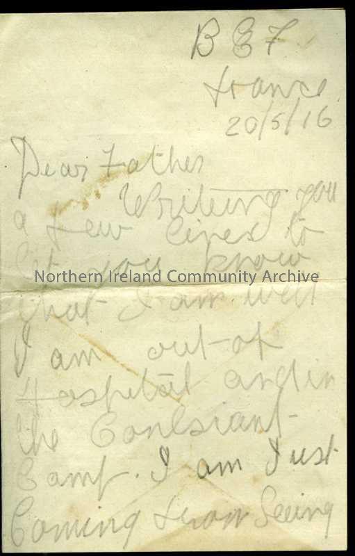 Double folded page of handwritten letter in pencil from James to his father. Signs off as Private Henry. In convalescent camp but wishes was back with his chums even if it is in trenches. Still no letters from home