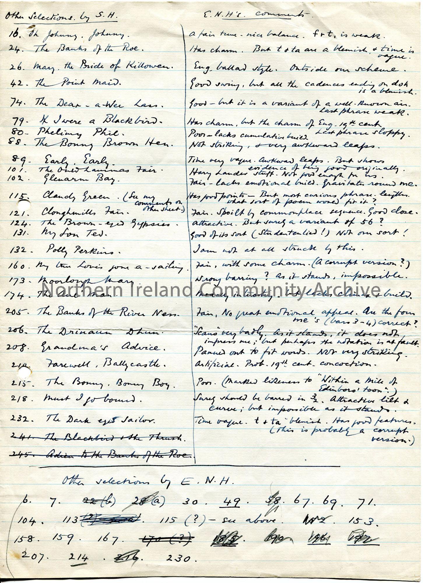 Double page with writing on 2 sides. Outer page – handwritten list of song titles by Sam, with list of comments (good and bad) against each by ENH – N…