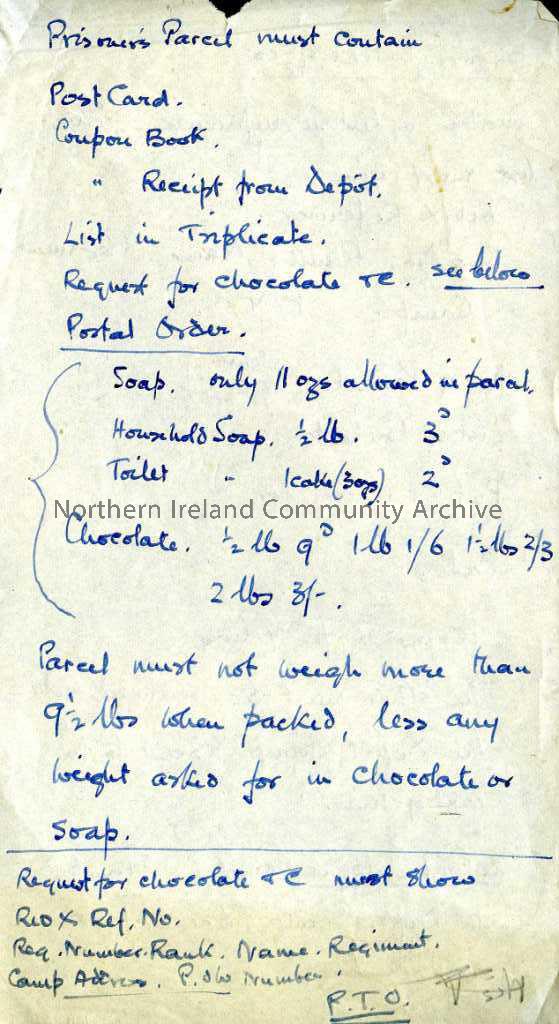Double sided, handwritten note which lists what a Prisoner’s parcel must contain. The other side lists what should be done before a parcel goes.