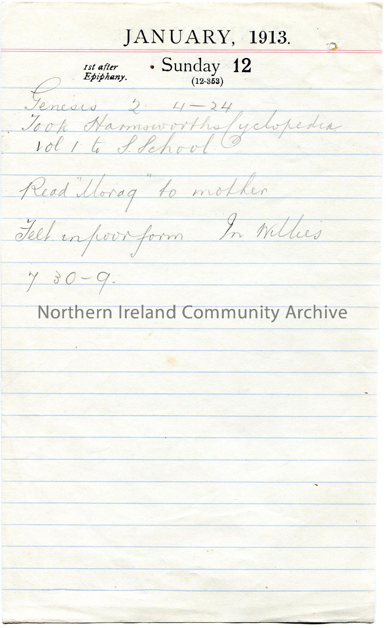 Double sided page from a diary belonging to Sam Henry. One side January, 1913 Saturday 11. The other side January, 1913 Sunday 12. Both sides contain … – img162b