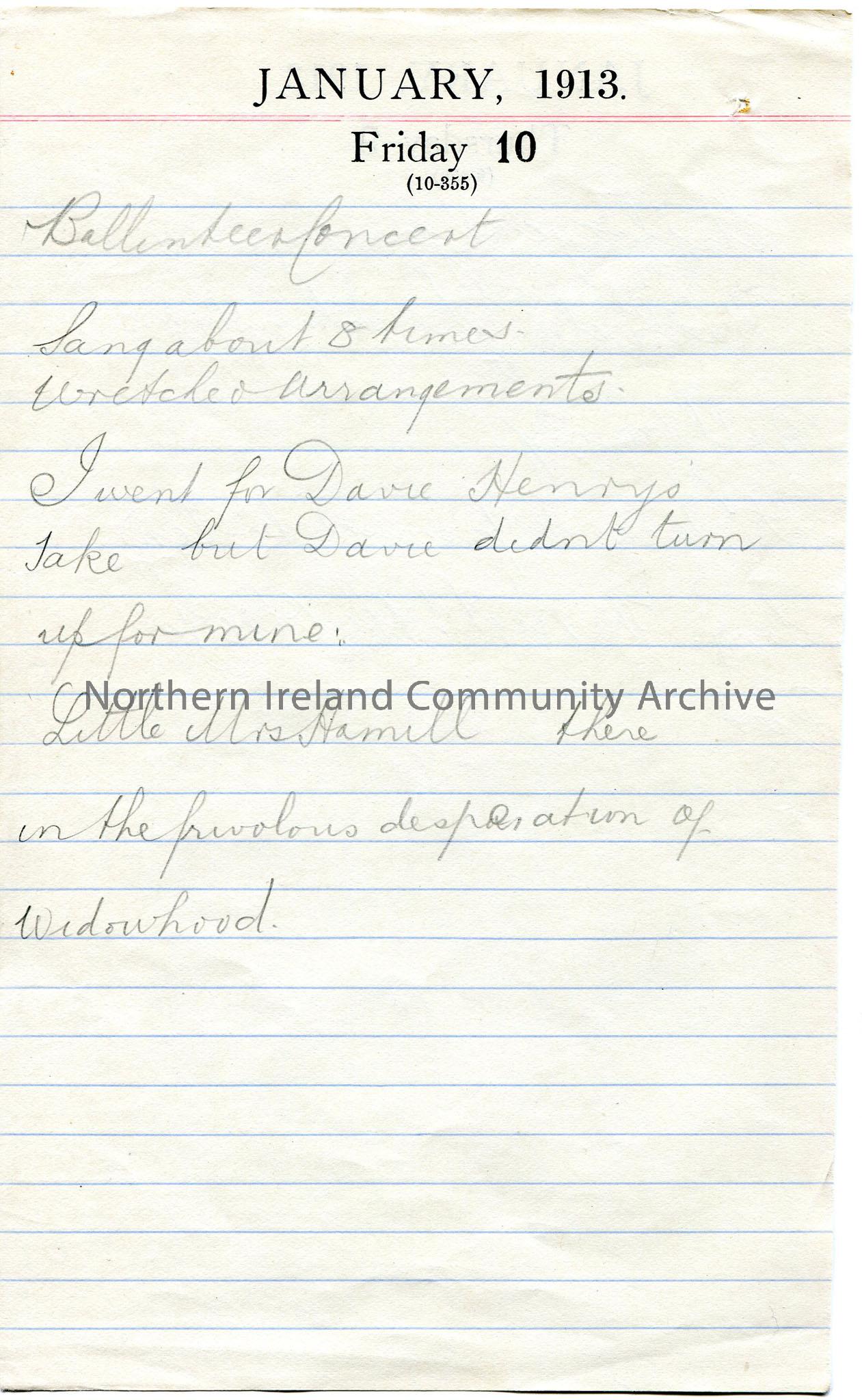 Double sided page from a diary belonging to Sam Henry. One side January, 1913 Thursday 9. The other side January, 1913 Friday 10. Both sides contain handwritten notes in pencil.