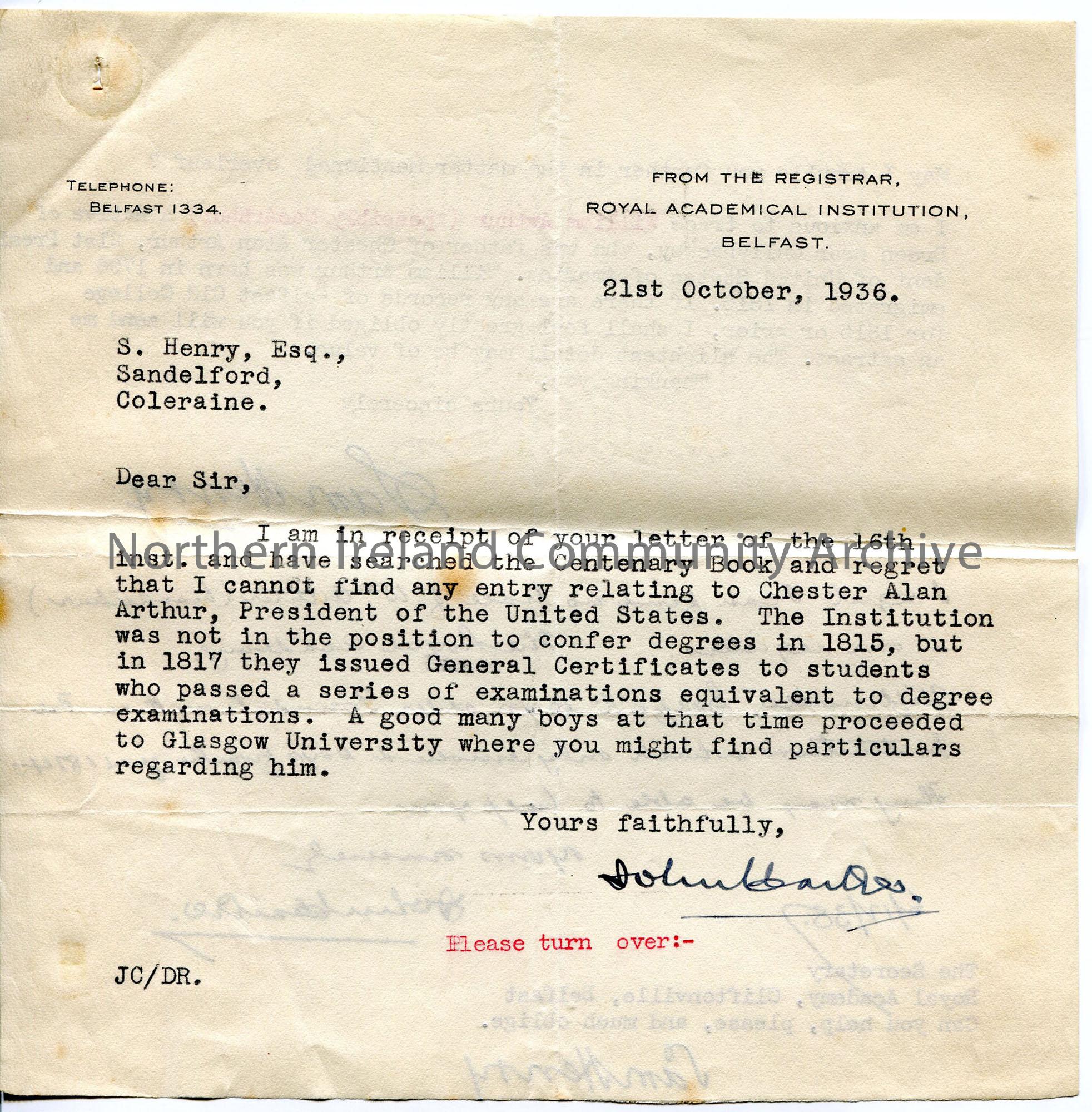Double sided typed and handwritten letter. Main side - answer to Sam from Belfast Academical Institution - no mention of Chester Alan Arthur in books. Reverse - another query to same from Sam re Chester's father William - handwritten reply from same finds no trace and refers him to The Royal Academy at Cliftonville