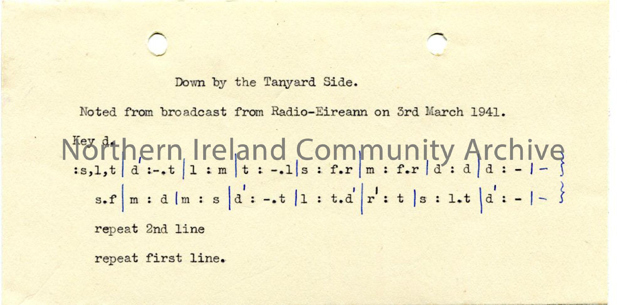 Typed tonic sol-fa notation to 'Down by the Tanyard Side'. Tune noted from broadcast on Radio Eireann on 3.3.1941.