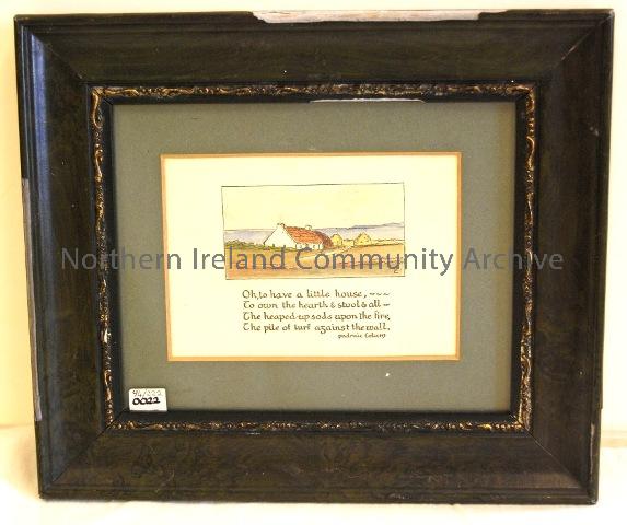 The Old Woman of the Roads. A framed illustration, similar in style to 1994/110 and 1994/111, of the poem by Padraig Colum. The art work is by Madge Gilmer. Courtesy of Ballycastle Museum.