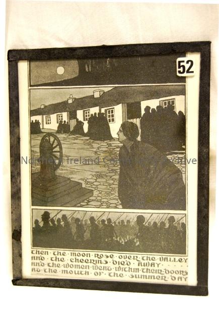 The Women at their Doors. Copy of pen and wash drawing by John Cambell to illustrate his brother, Joseph Campbell's poem of the same name - some lines from the poem are repeated at the bottom. The poem appeared in the magazine 'Uladh', a short lived literary and critical journal (1904-5), edited by Bulmer Hobson, as organ of the Ulster Literary Theatre and first appearing in 1904.The cover of the magazine portrayed an armed warrior with a torch bearing companion and is encompassed with Celtic interlacing. The cover was also the work of John Campbell. Courtesy of Ballycastle Museum.