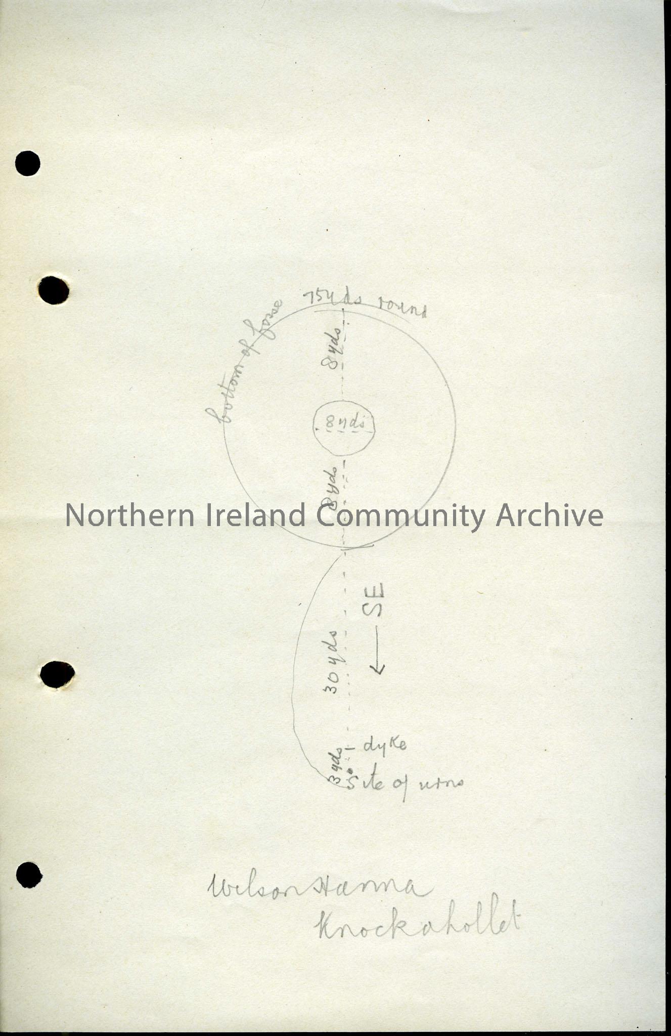 Drawings,showing the location of two urns discovered at Knockahollet. The name Wilson Hanna is at the bottom of the page. He was probably the landowner.