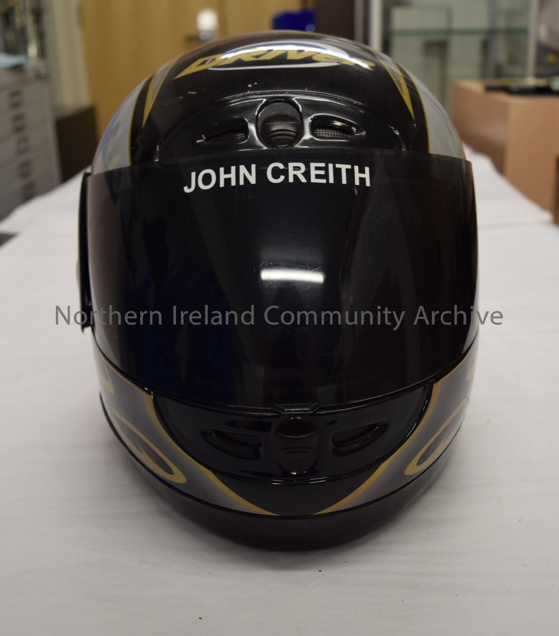 Driver motorcycle helmet belonging to John Creith. Black helmet with silver and gold pattern.
