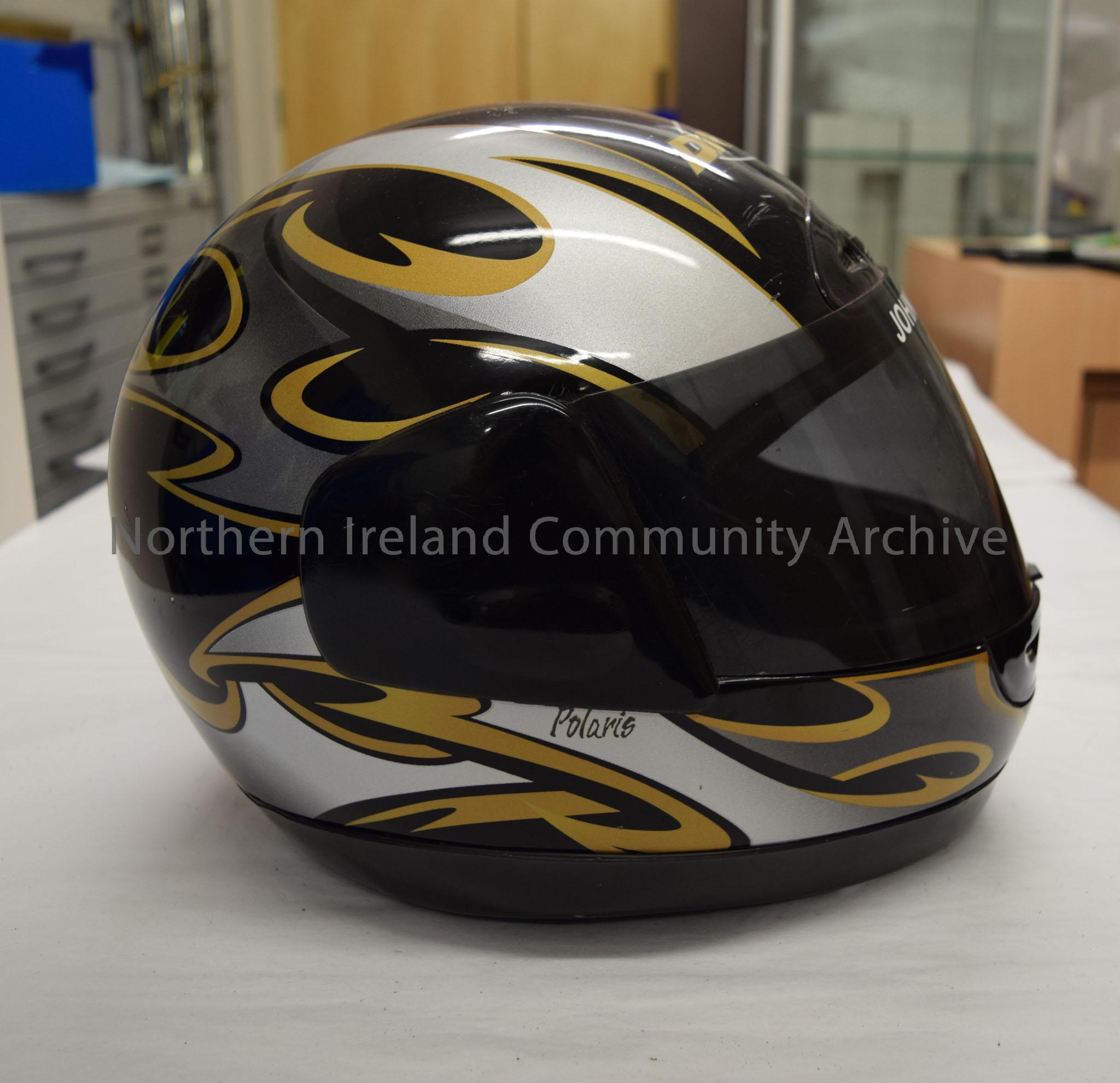 Driver motorcycle helmet belonging to John Creith. Black helmet with silver and gold pattern. – 2016.88 (5)