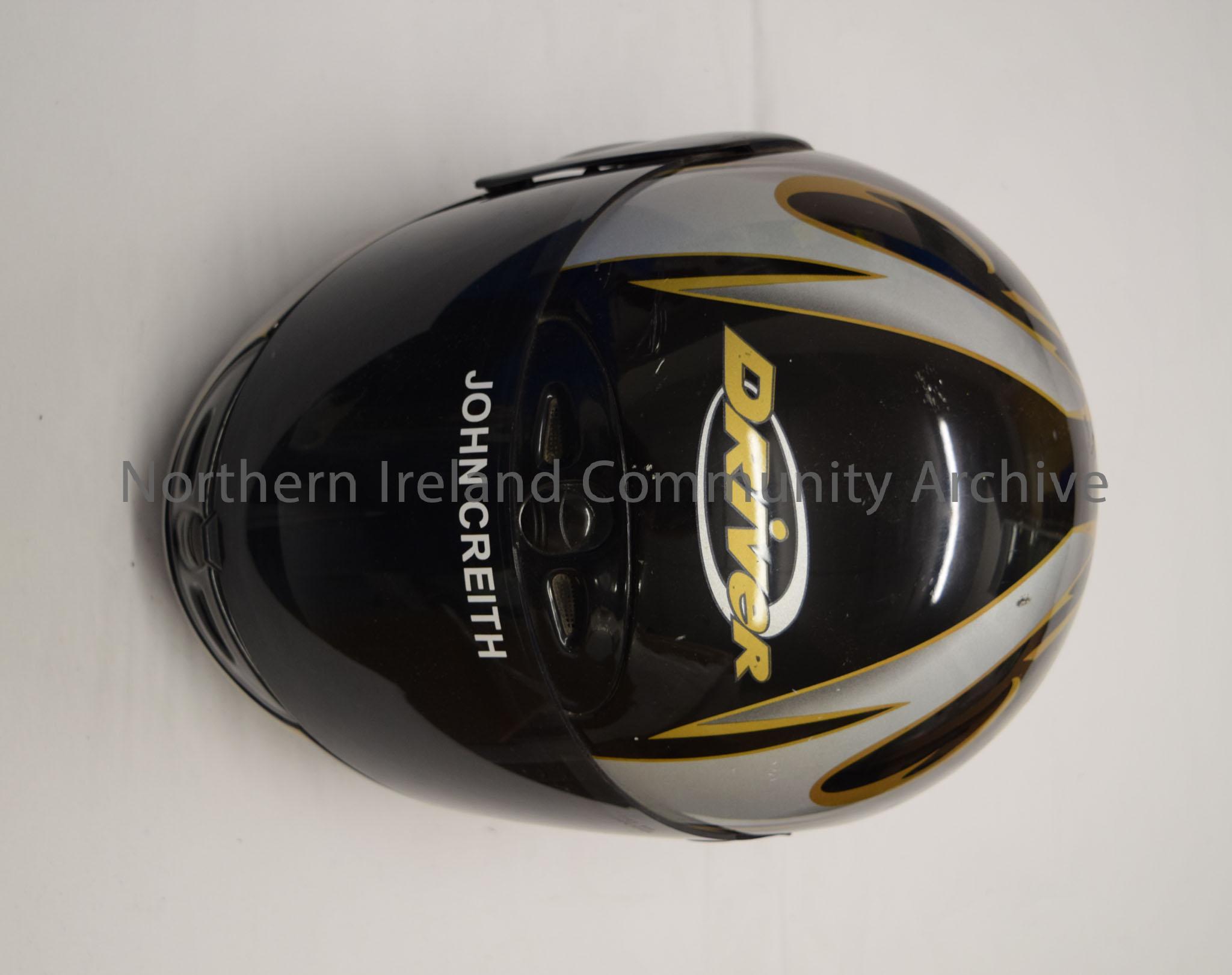 Driver motorcycle helmet belonging to John Creith. Black helmet with silver and gold pattern.