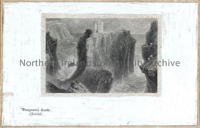 Print of drawing of Dunseverick Castle by WH Bartlett. Courtesy of Ballycastle Museum.