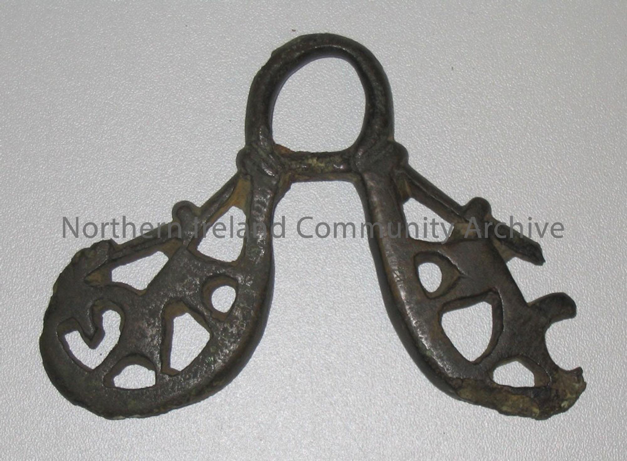 Each of the two wings of the cheek piece incorporate a crude design of a horse.