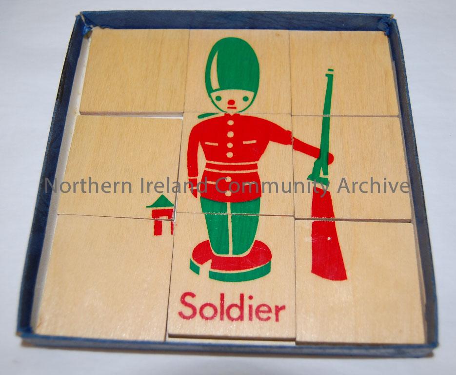 'Early Stages/first number jigsaw/ Addition/ Subtraction Number 1'. Jigsaw to assist learning, 9 wooden pieces making up a green and red illustration of toy soldier. Contained in a blue cardboard box. Made by James Galt & Co, c.1970.
