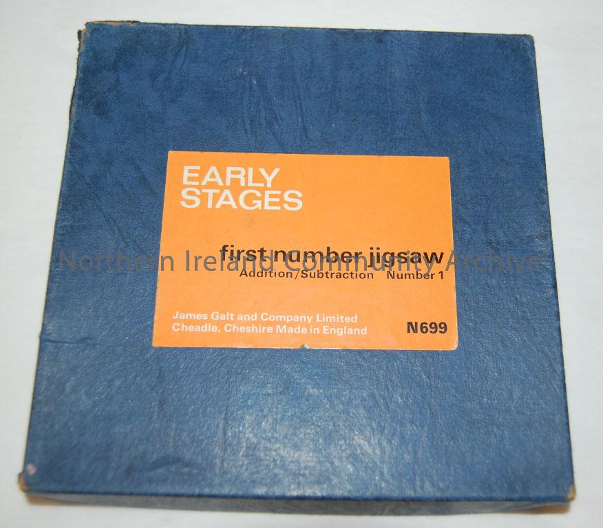 'Early Stages/first number jigsaw/ Addition/ Subtraction Number 1'. Jigsaw to assist learning, 9 wooden pieces making up a green and red illustration of toy soldier. Contained in a blue cardboard box. Made by James Galt & Co, c.1970.