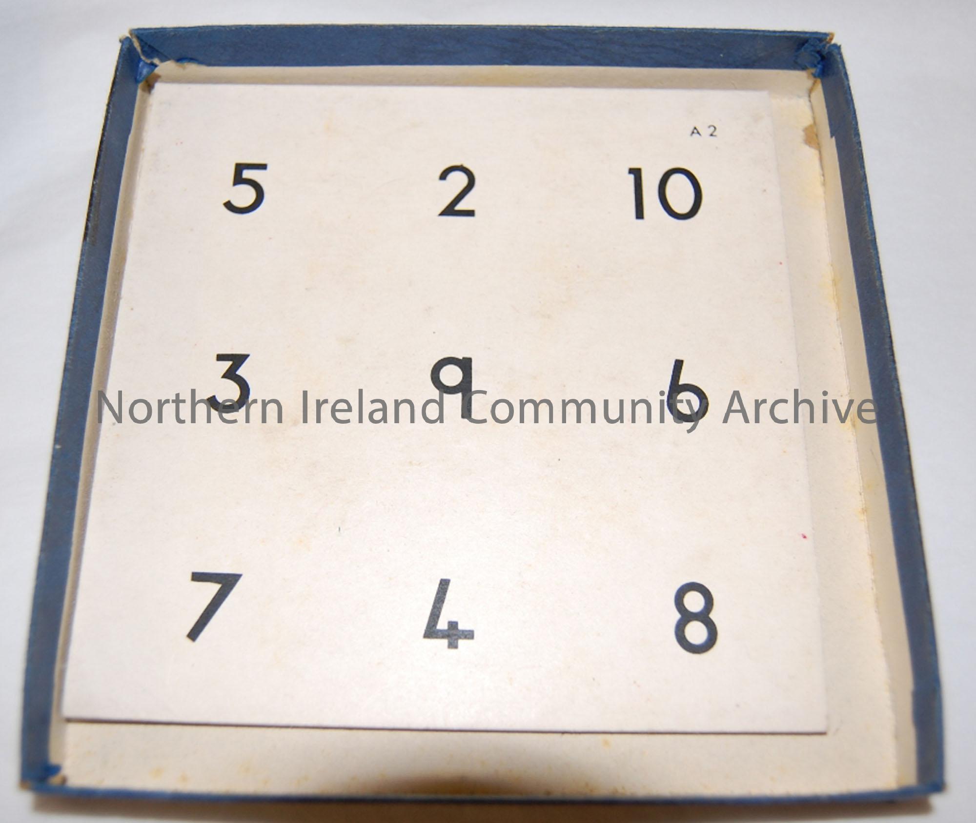 'Early Stages/first number jigsaw/ Addition/ Subtraction Number 1'. Jigsaw to assist learning, 9 wooden pieces making up a green and red illustration of toy soldier. Contained in a blue cardboard box. Made by James Galt & Co, c.1970.