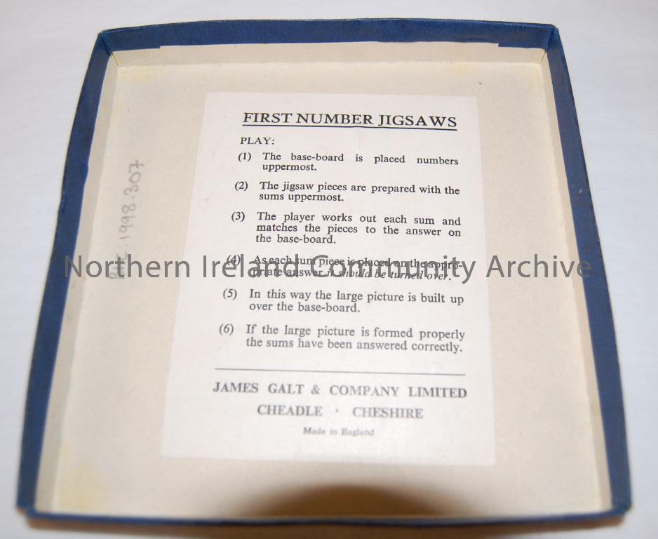 'Early Stages/first number jigsaw/Subtraction Set S3'. Jigsaw to assist learning, 9 wooden pieces making up a green and red illustration of duck. Contained in a blue cardboard box. Made by James Galt & Co, c.1970.