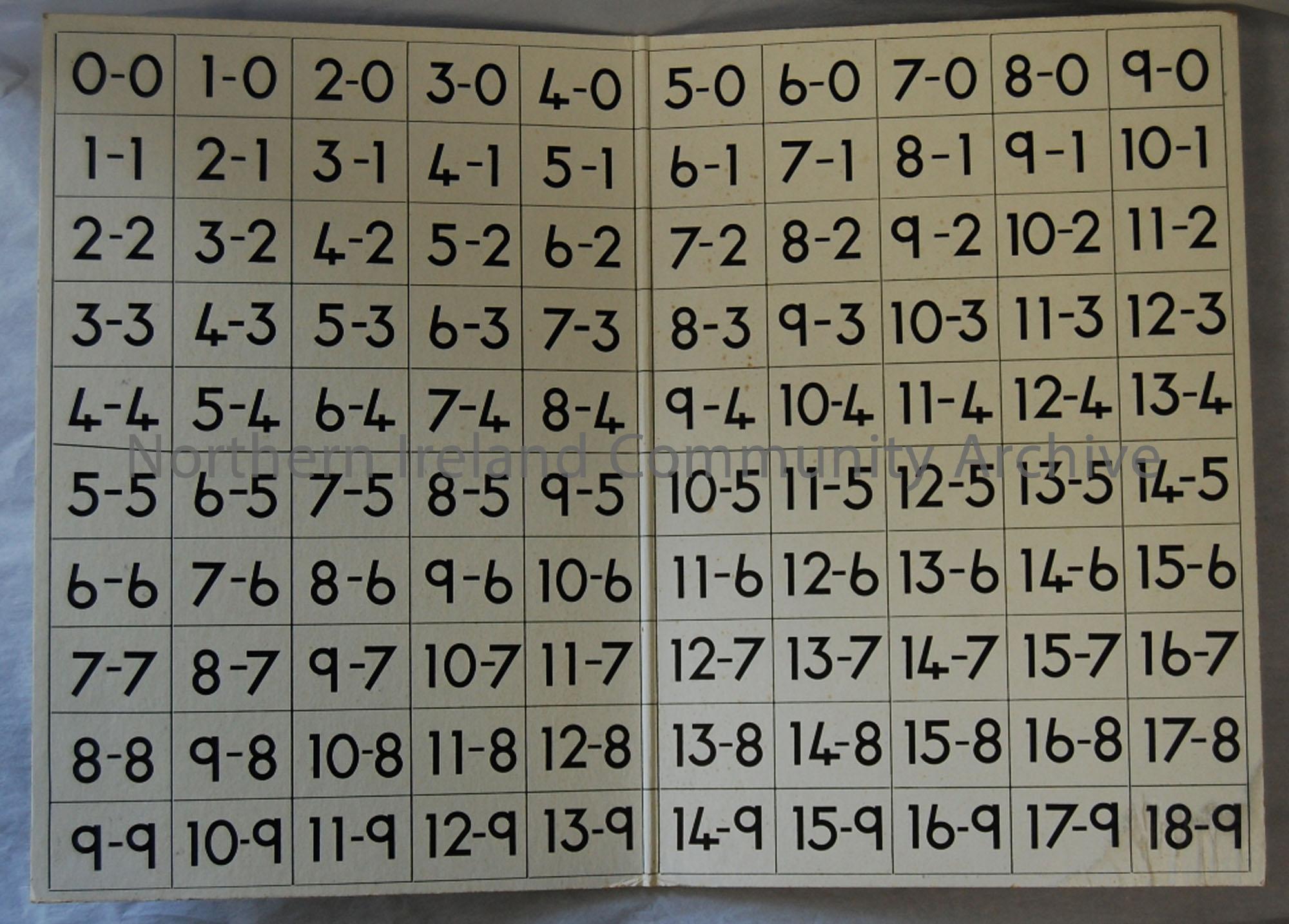 'Early stages/Taking bond board/James Galt and Company Limited...Made in England'. Folded in two, cover is blue, with an orange sticker, inner surface is white with black print. Used as an aid to teaching simple subtraction. Damage in lower right corner.
