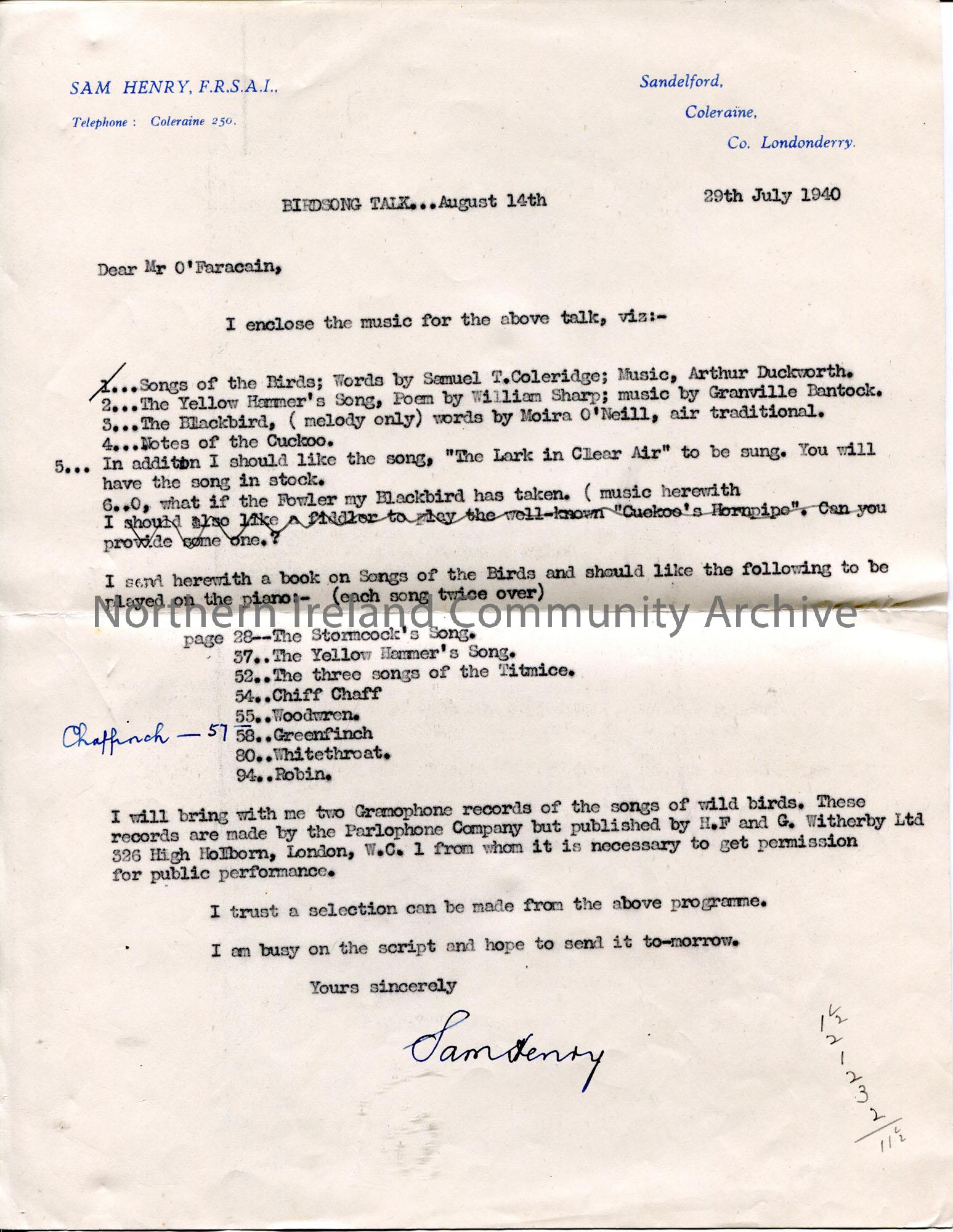 Edited version of a typed letter to Mr O'Farachain from Sam Henry. Re a birdsong talk on 14th August 1940. List of songs for the talk. Encloses book on 'Songs of the Birds' and lists songs to be played on piano. Sam to bring two gramophone records of songs of wild birds and the script is in progress.
