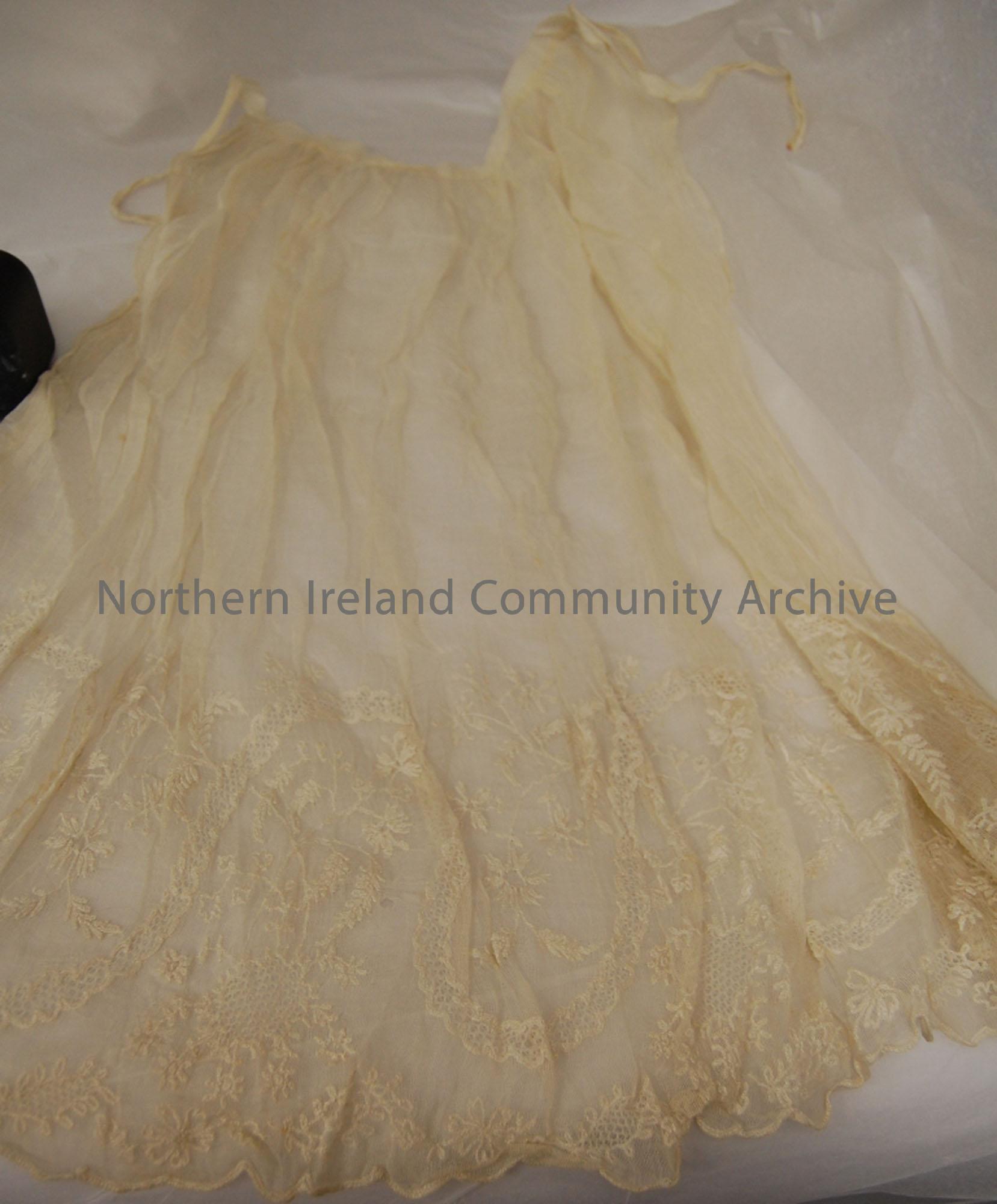 Edwardian fine lace apron with flower stitching along the bottom and ties for around the waist.