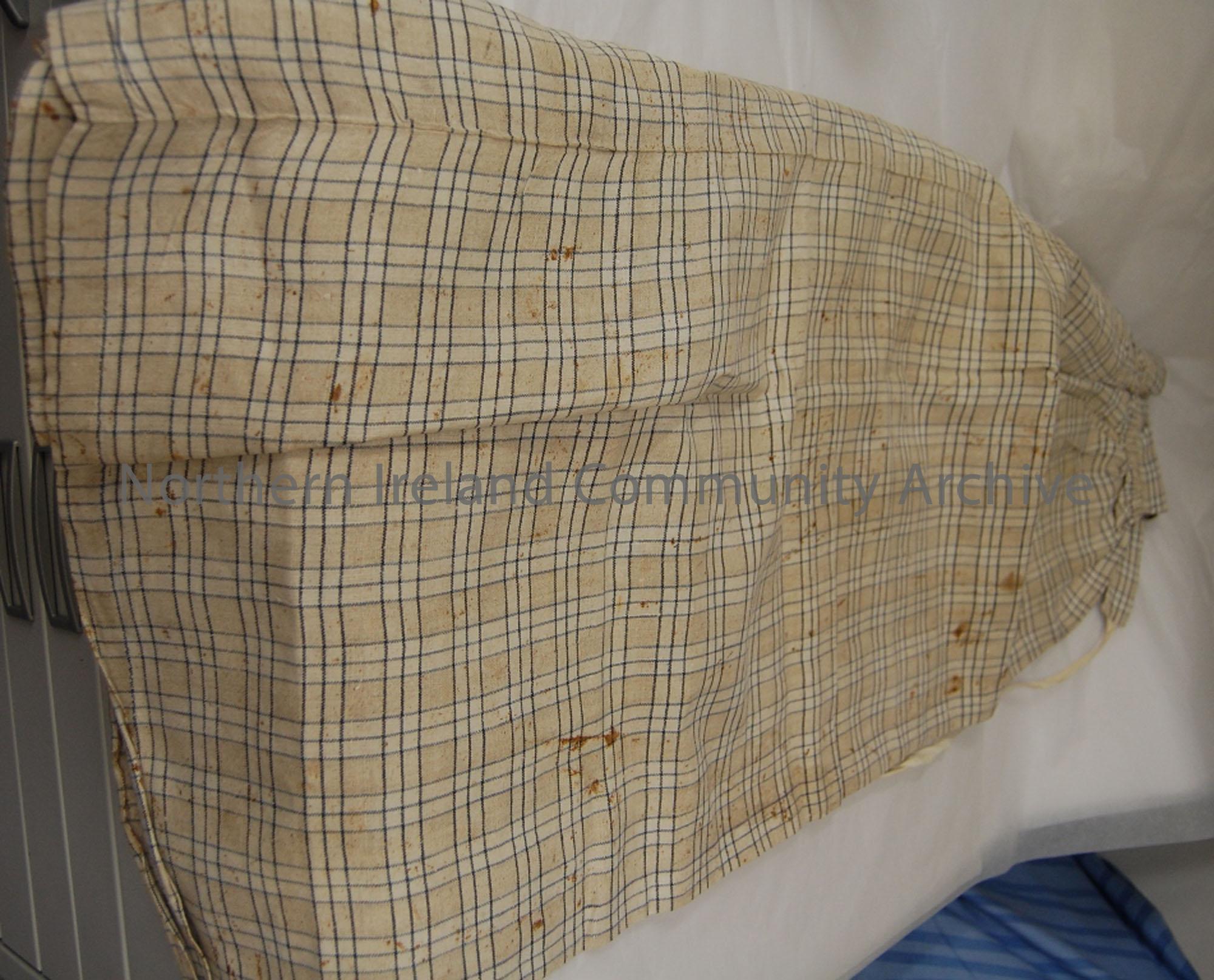 Edwardian fine large linen aprons. Checked, cream and blue pattern with elasticated waist and tie for around the waist.
