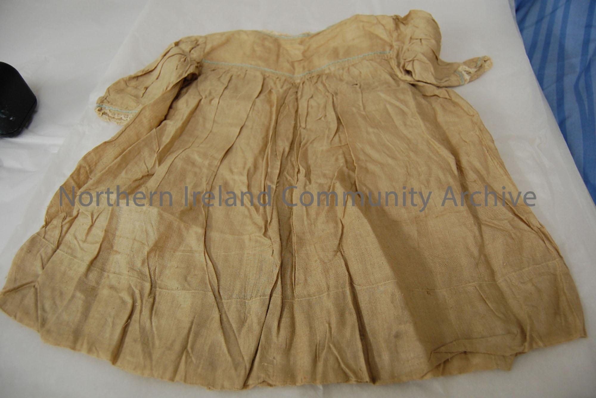 Edwardian short sleeved baby dress. One has blue stitching around neck and sleeves and the other has white stitching. Both have lace at the bottom of …