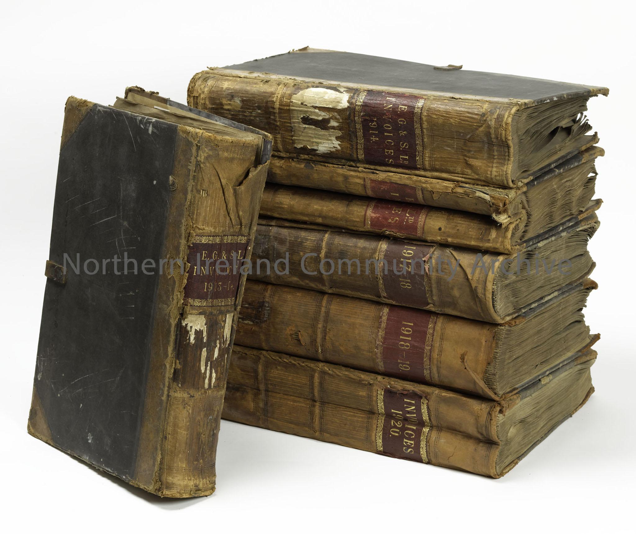 ledger from Gribbon Mill. Titled, 'E.G.and S.L. Invoice 1918-19.' Large 75 page long ledger which contains various invoices, details of scales between the Gribbon Mill and other companies and collection of rent from other bodies. Includes red book attached to the inner back cover.