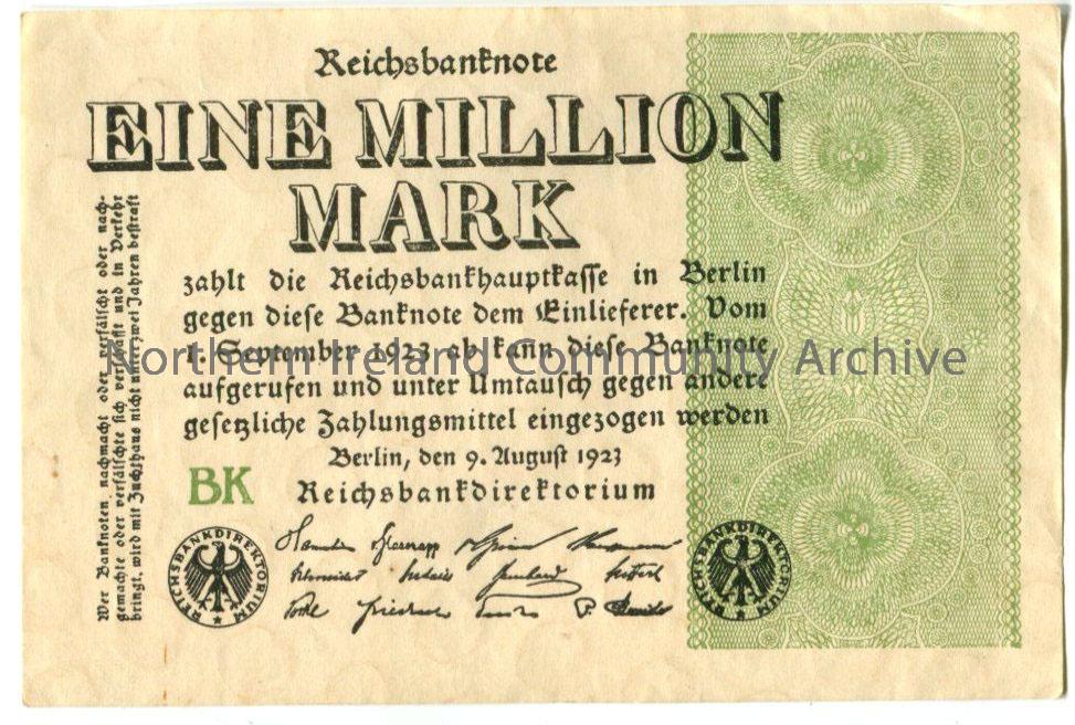 Eine Million Mark banknote. Cream background with a green intricate patterned rectangle on the right and German text in Gothic style font.