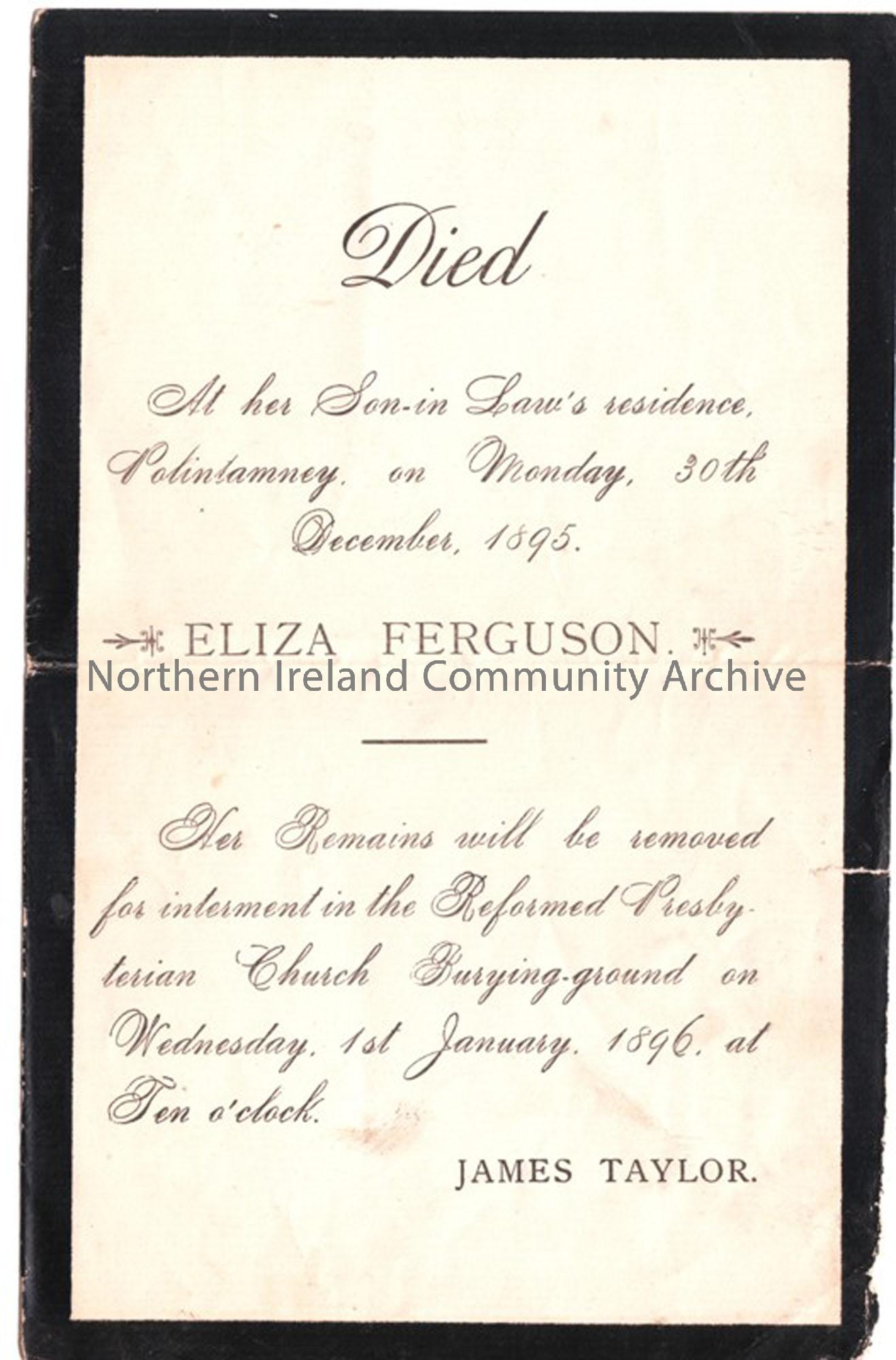 Eliza Ferguson of Polinlamney, buried in Reformed Presbyterian Burying Ground, Ballymoney d. 30th December 1895