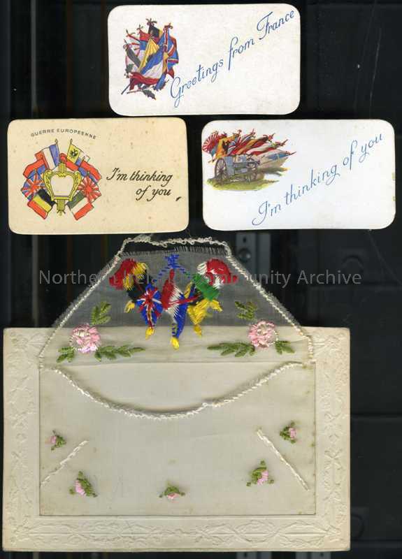 Embroidered postcard with flag of Belgium, Union Jack, Russian Imperial Flag (1699-1917) and Italy (1848-1946). 'Secret' flap with 3 small cards inside.