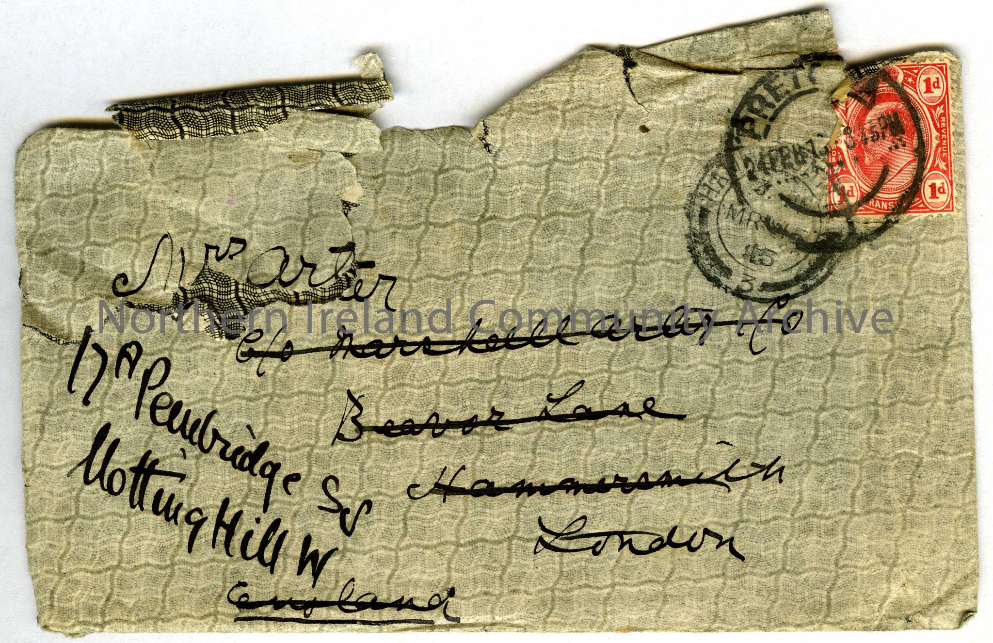 envelope addressed to Mrs Arter, 17a Pewbridge St. Notting Hill W. Previous address scored out as c/o Marshall Arter & Co Beavor Lane Hammersmith Lond…