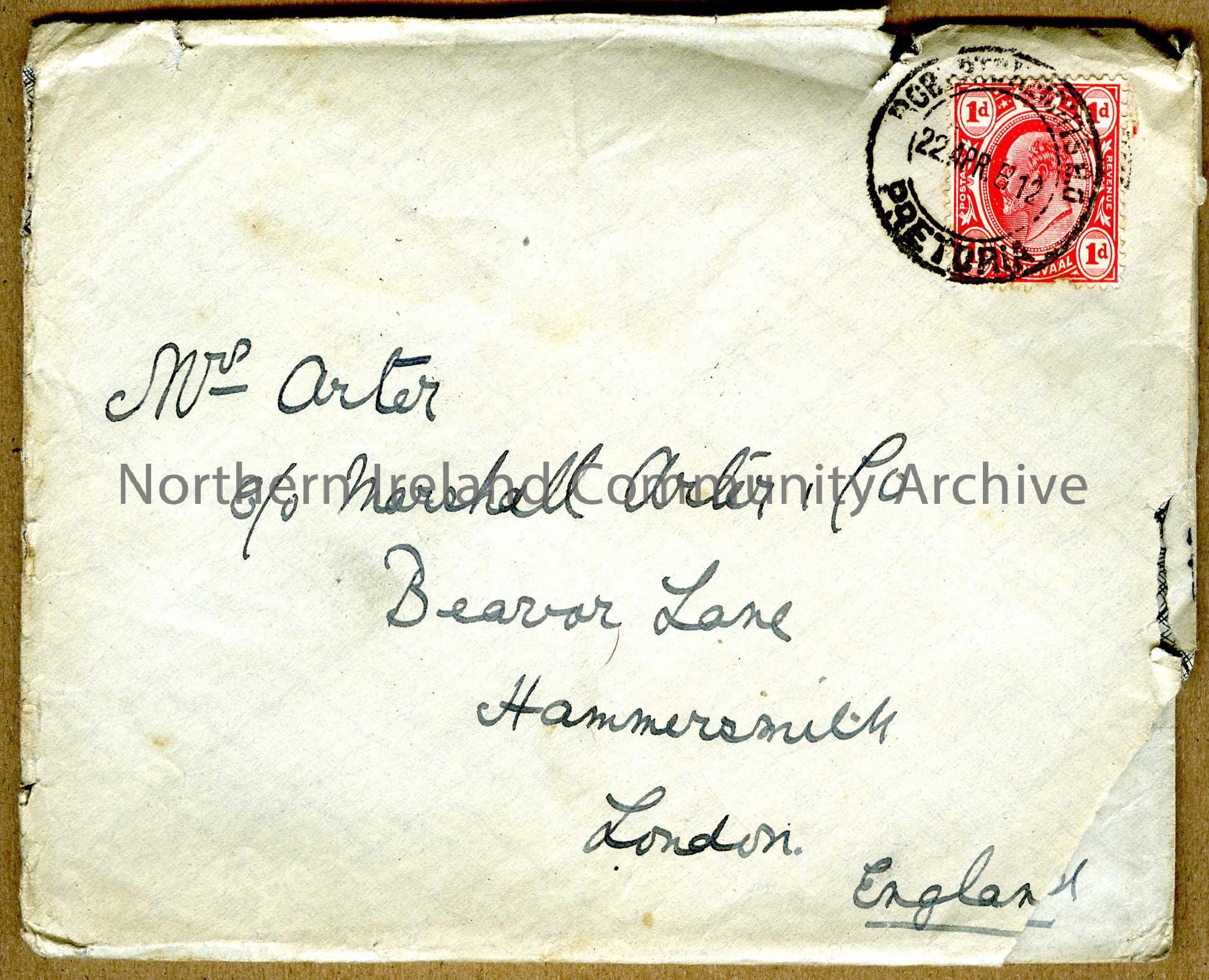 envelope addressed to Mrs Arter c/o Marshall Arter, Co, Beavor Lane, Hammersmith, London, England. Date stamped 22nd April 1912. Stamped Hammersmith 12.15pm