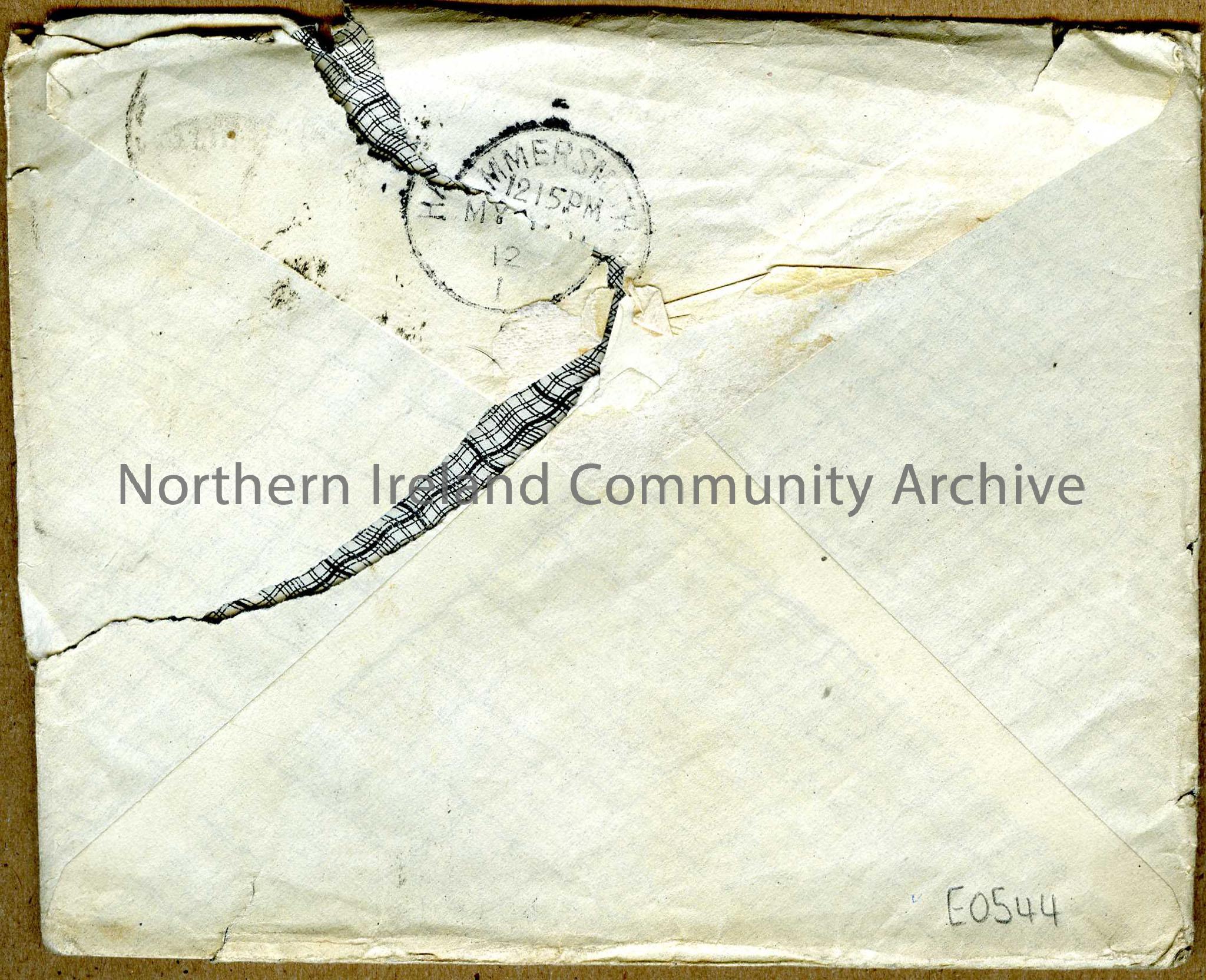 envelope addressed to Mrs Arter c/o Marshall Arter, Co, Beavor Lane, Hammersmith, London, England. Date stamped 22nd April 1912. Stamped Hammersmith 12.15pm
