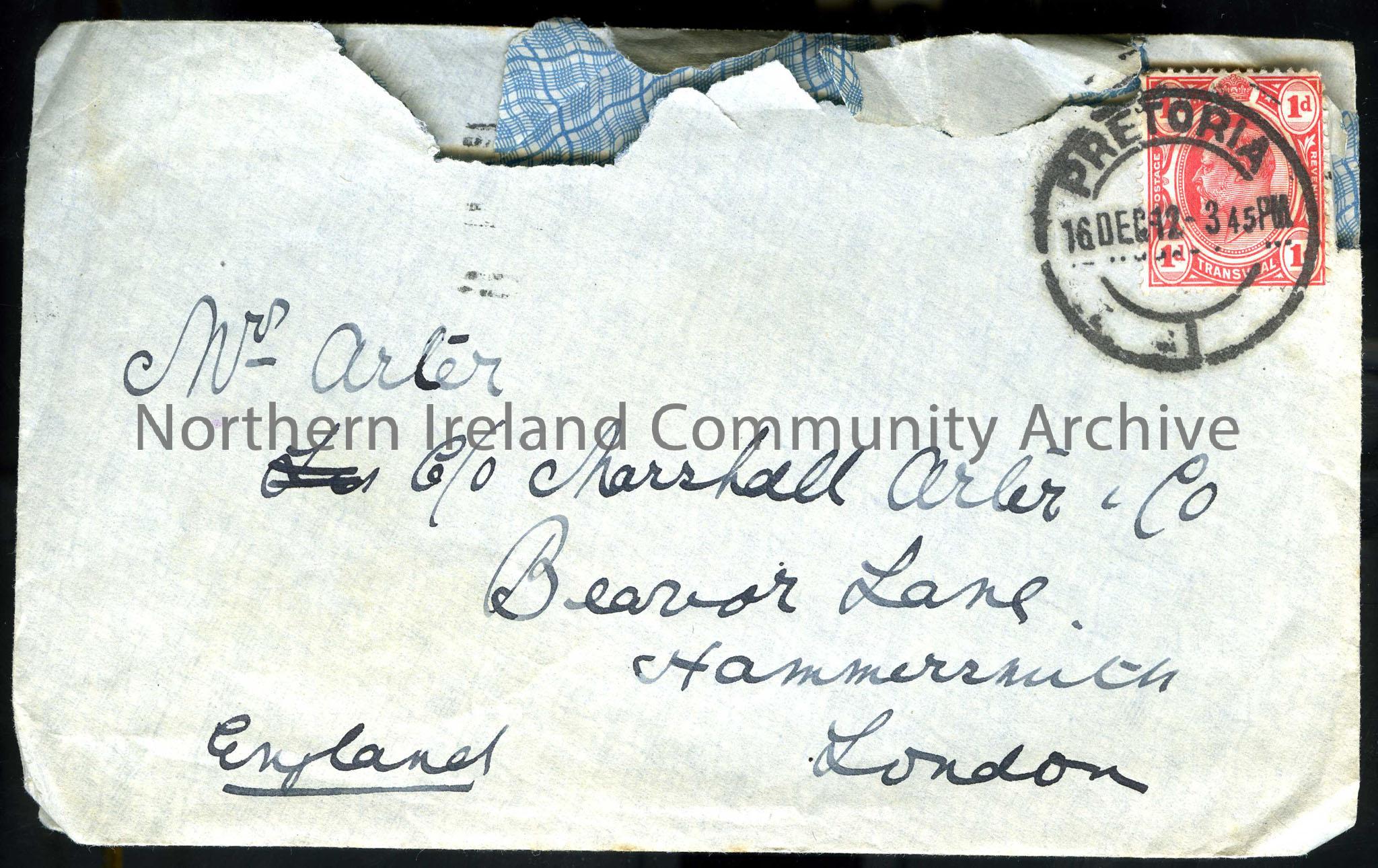 envelope addressed to Mrs Arter c/o Marshall Arter & Co Beavor Lane Hammersmith London England. Stamped Pretoria, 16 Dec 12, 3.45pm. Red postage stamp…
