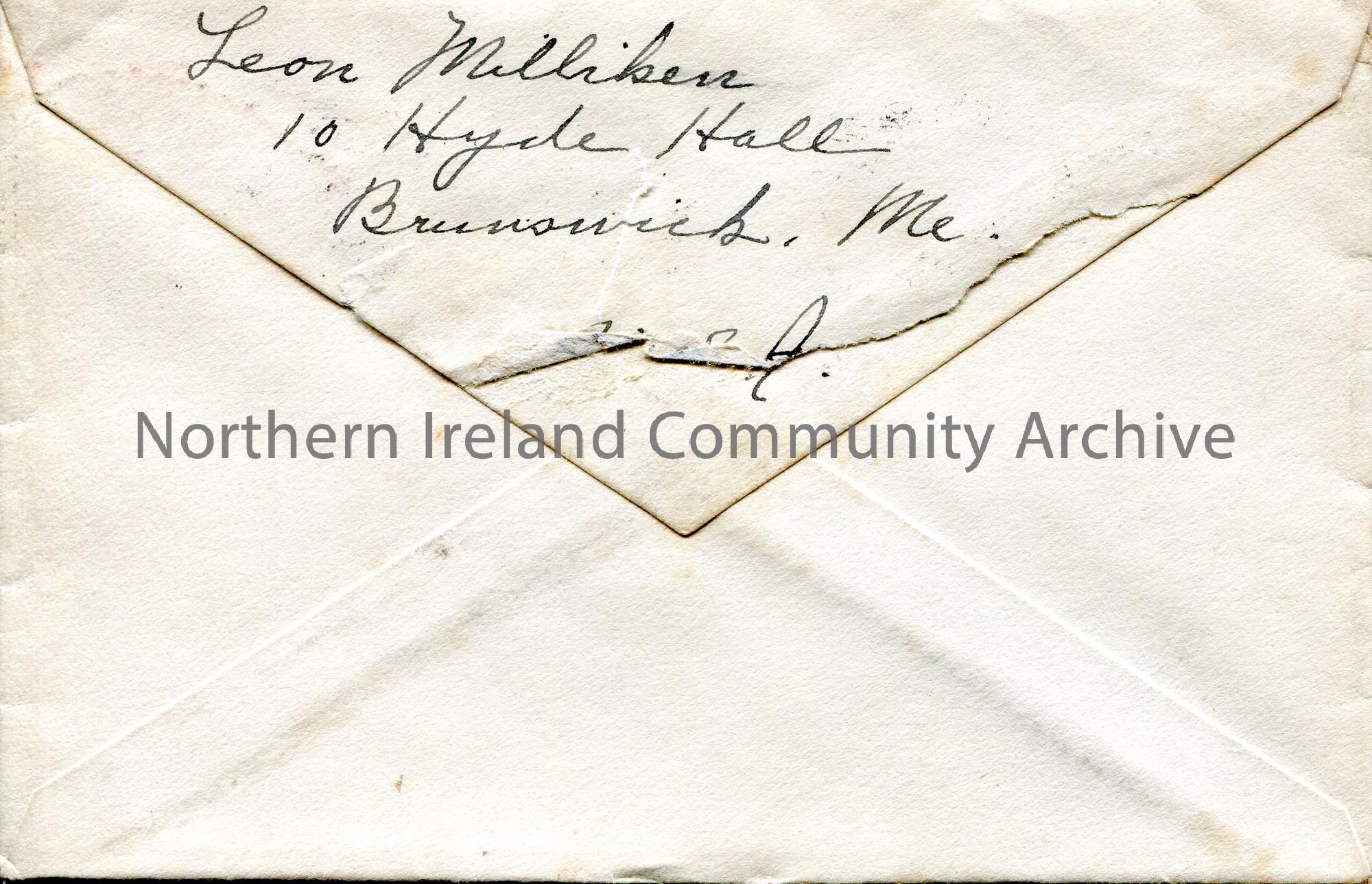 Envelope addressed to Sam Henry, Coleraine, Ulster, Ireland. Stamped Brunswick, Maine. 25th January, 1927. Two red 2 cents George Washington postage stamps. Address of Leon Milliken, 10 Hyde Hall, Brunswick, Maine on reverse.