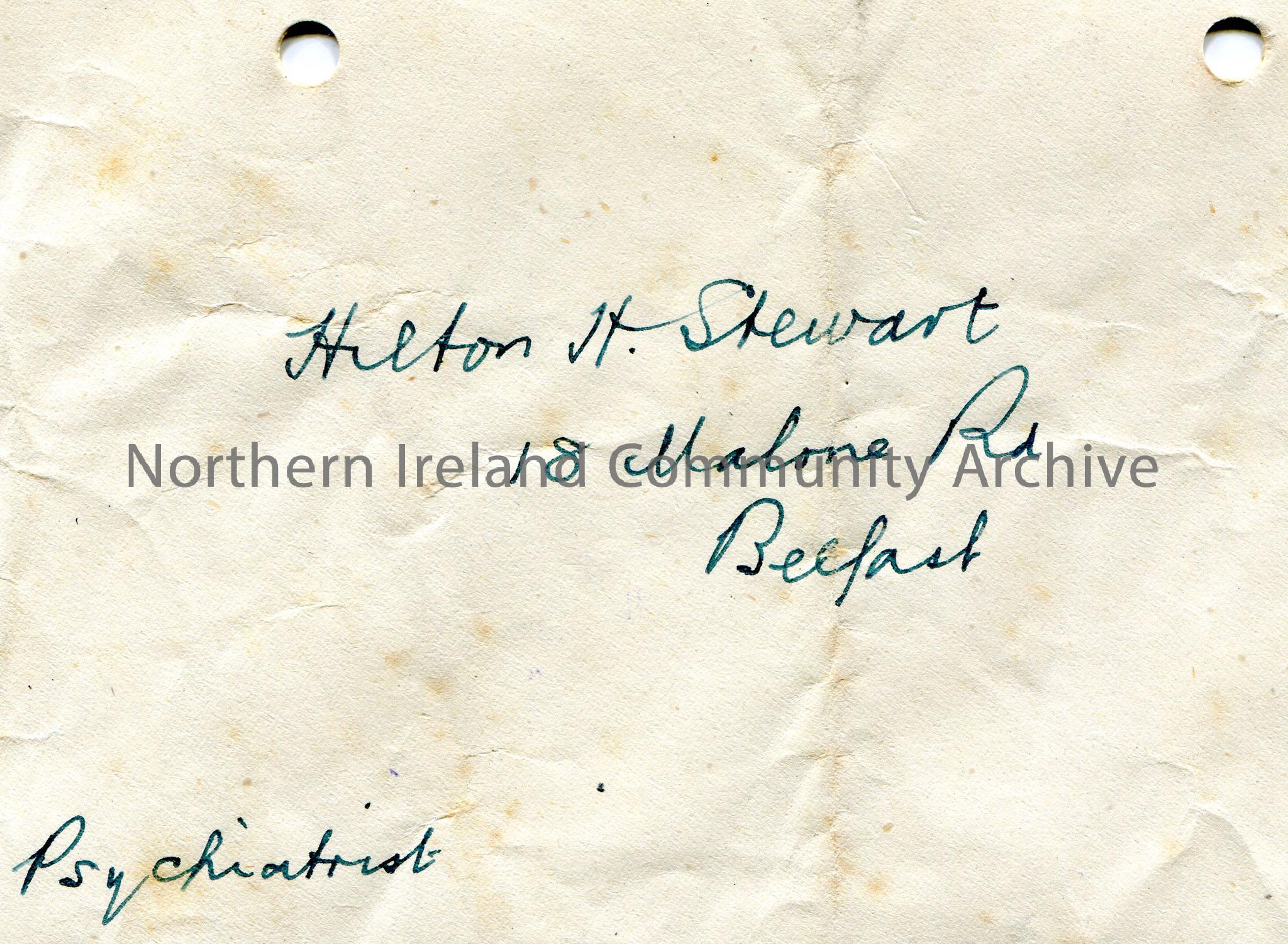 Envelope (empty) addressed to Hilton H. Stewart, 18 Malone Road, Belfast. ‘Psychiatrist’ written in bottom corner.