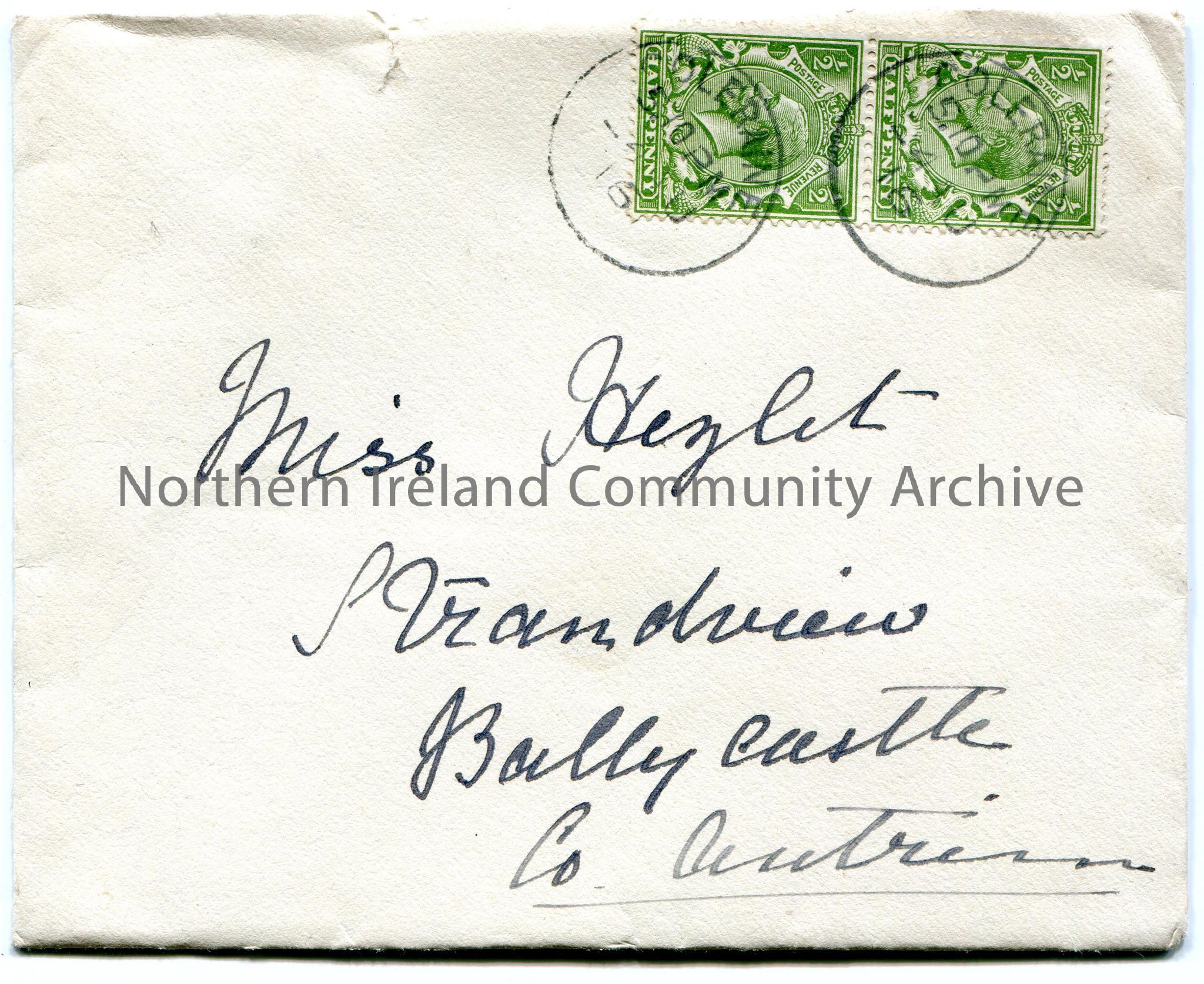 Envelope, handwritten addressed to Miss Hezlet, Strandview, Ballycastle, Co.Antrim. Stamped from Coleraine, 5.10pm, 1916. Two green halfpenny postage …