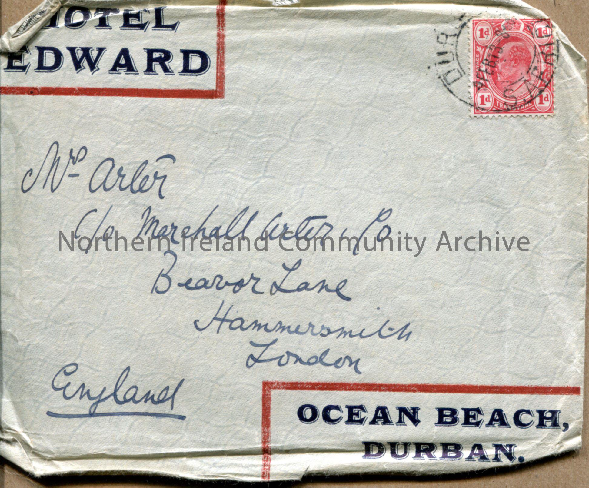 Envelope with Durban stamp, from hotel stationery of Hotel Edward in Ocean Beach, addressed to Mrs Arter.
