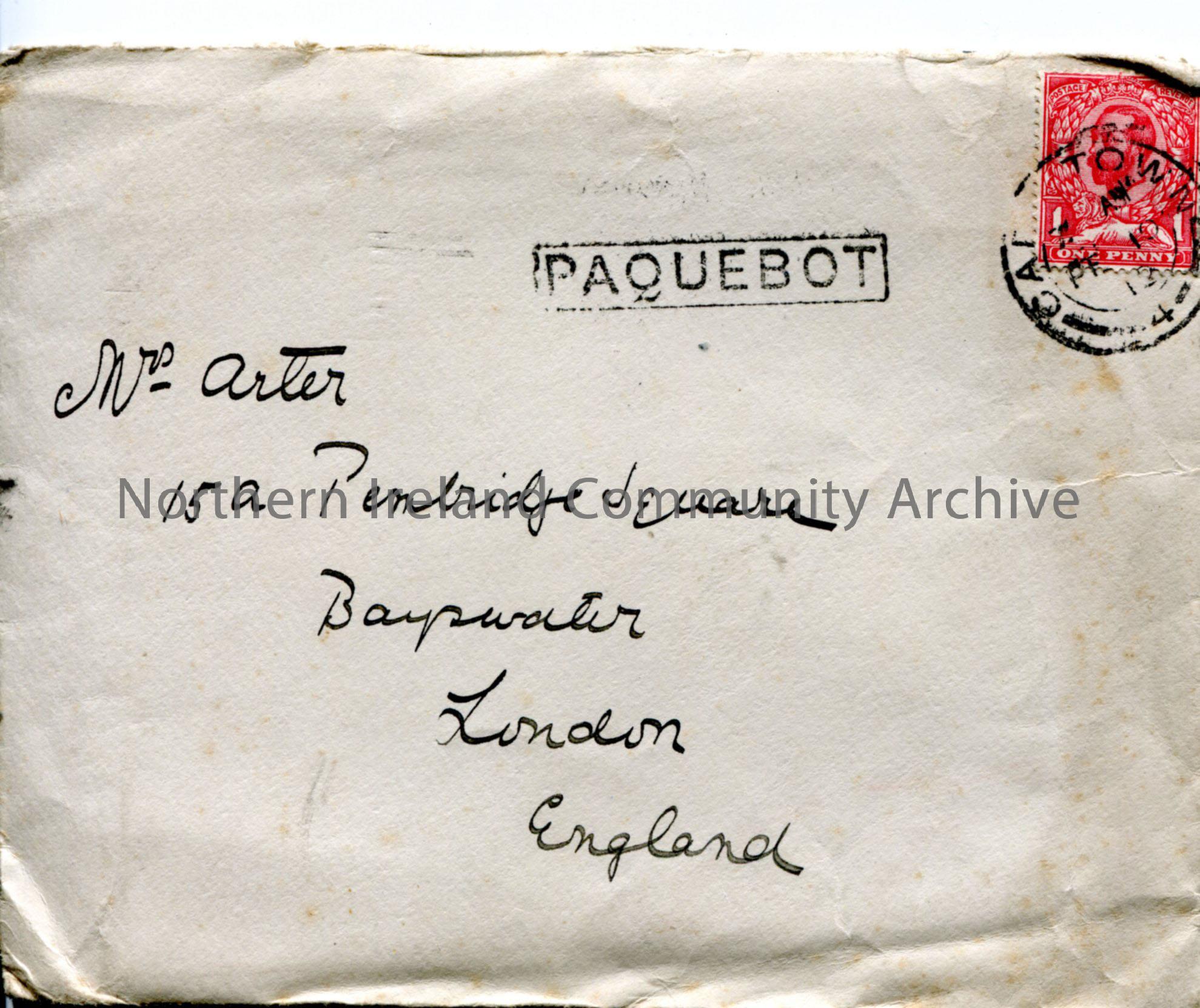Envelope with post stamp of Capetown and stamped ‘Paquebot’, addressed to Mrs Arter.