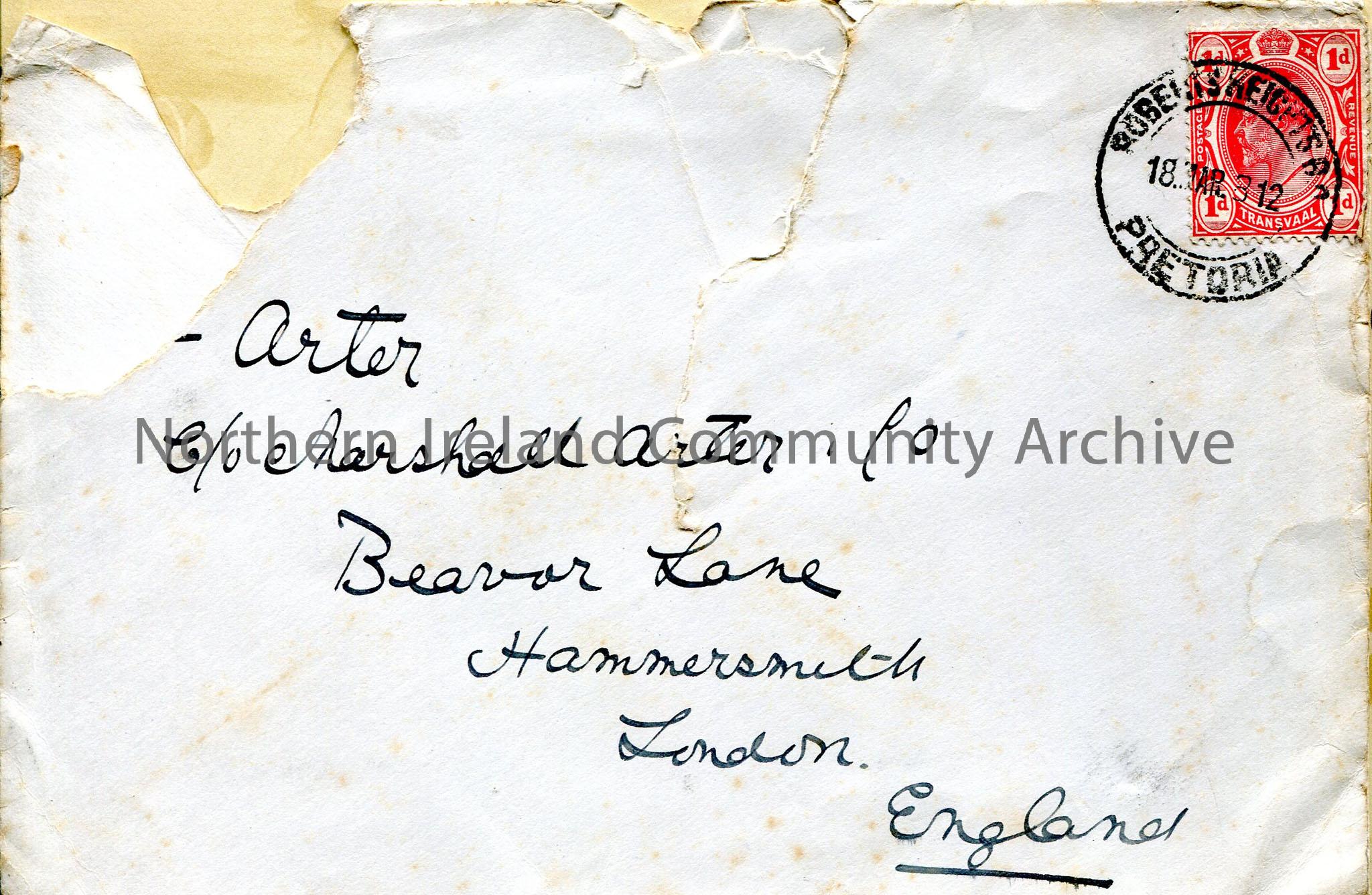 Envelope with post stamp of Pretoria, addressed to an Arter