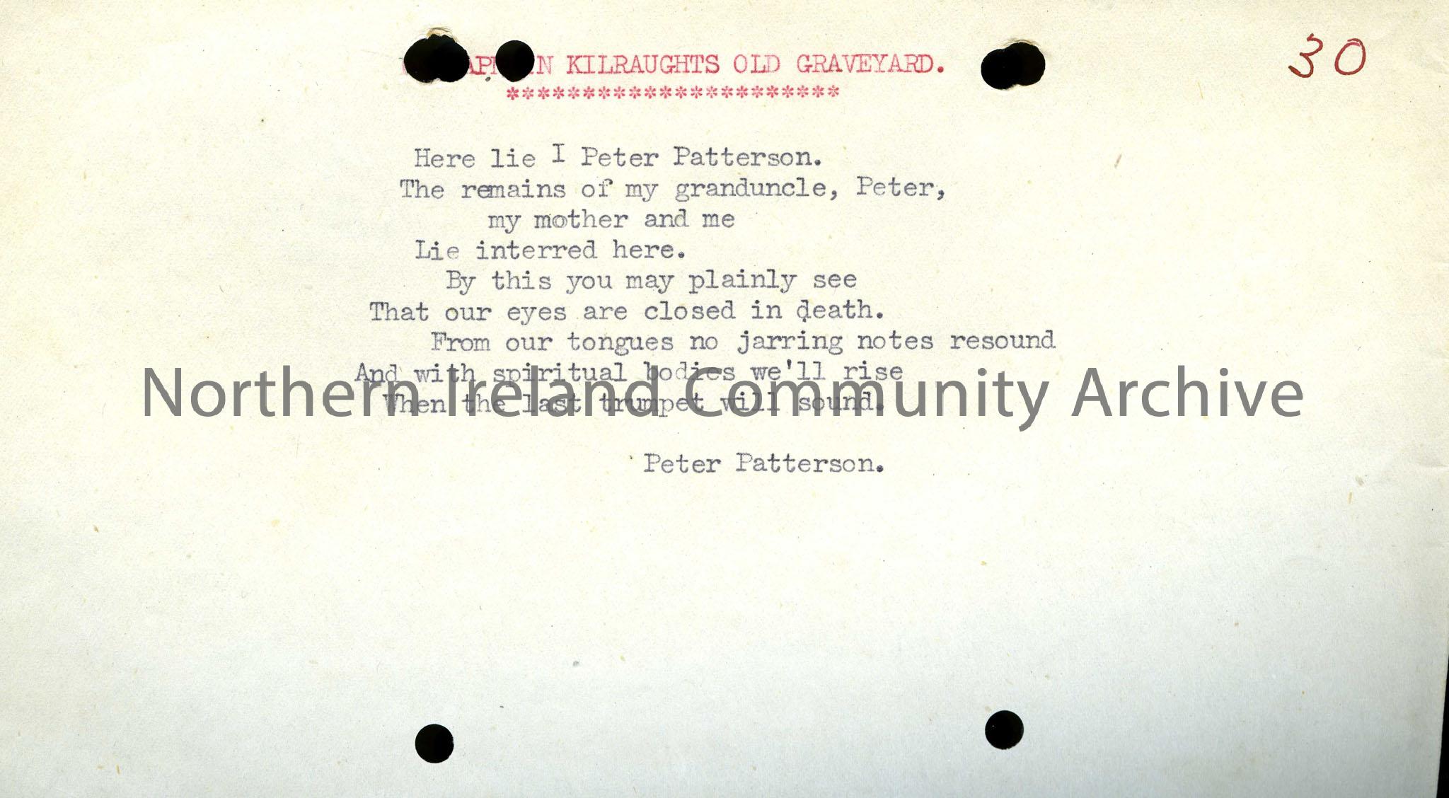 Epitaph for Peter Patterson taken from Kilraughts Old Graveyard.