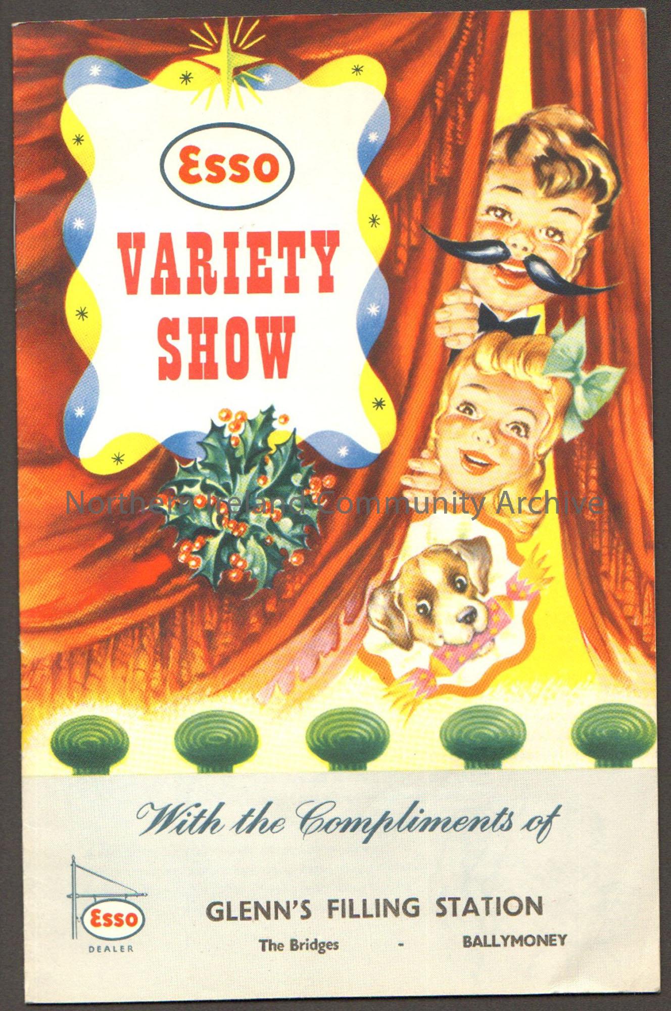Esso Variety Show with compliments of Glenn’s Filling Station 1958. Cover has image of a boy, a girl and a dog peeking out from behind a red stage cur…