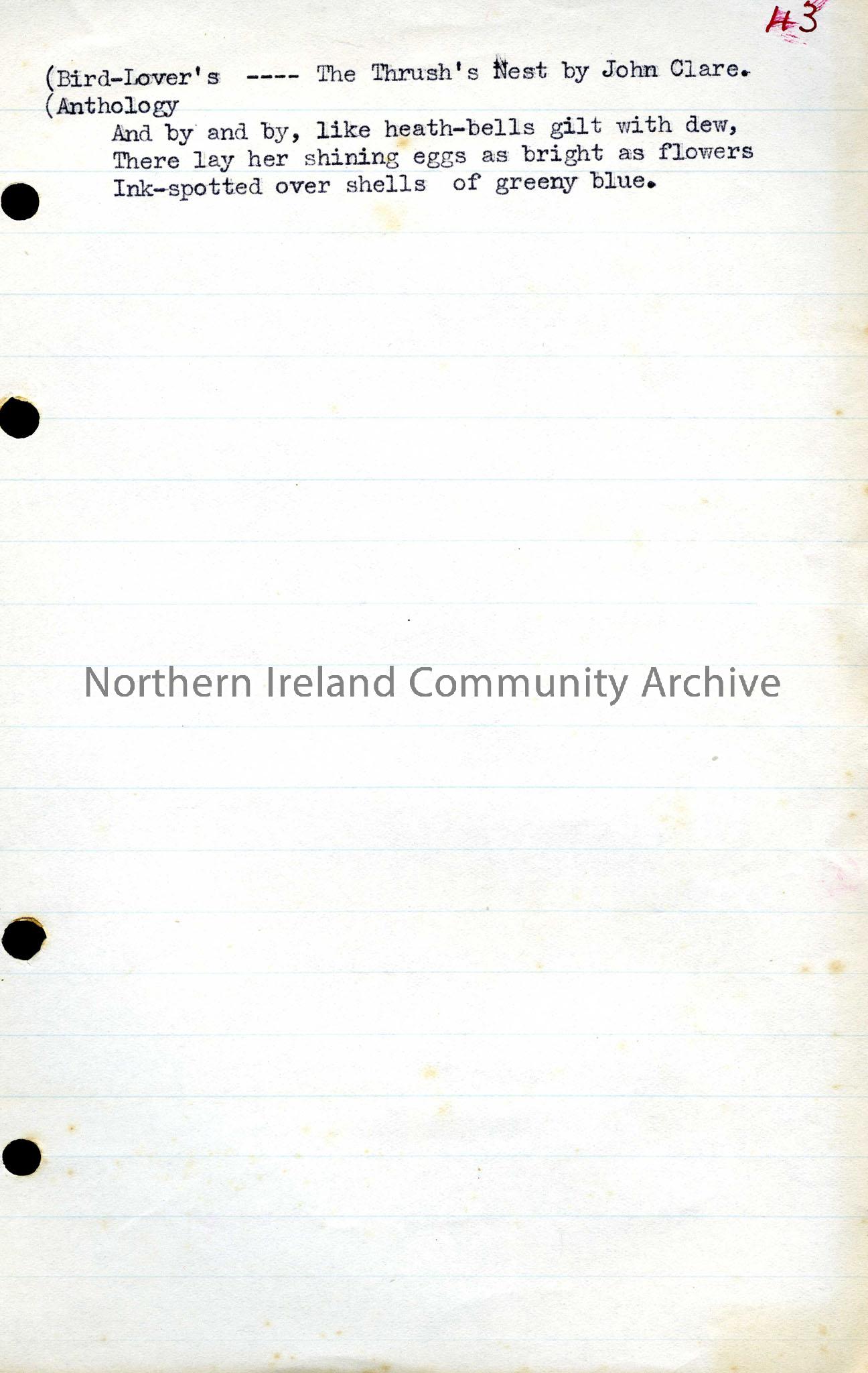 Excerpt from a poem entitled "The Thrush's Nest by John Clare.