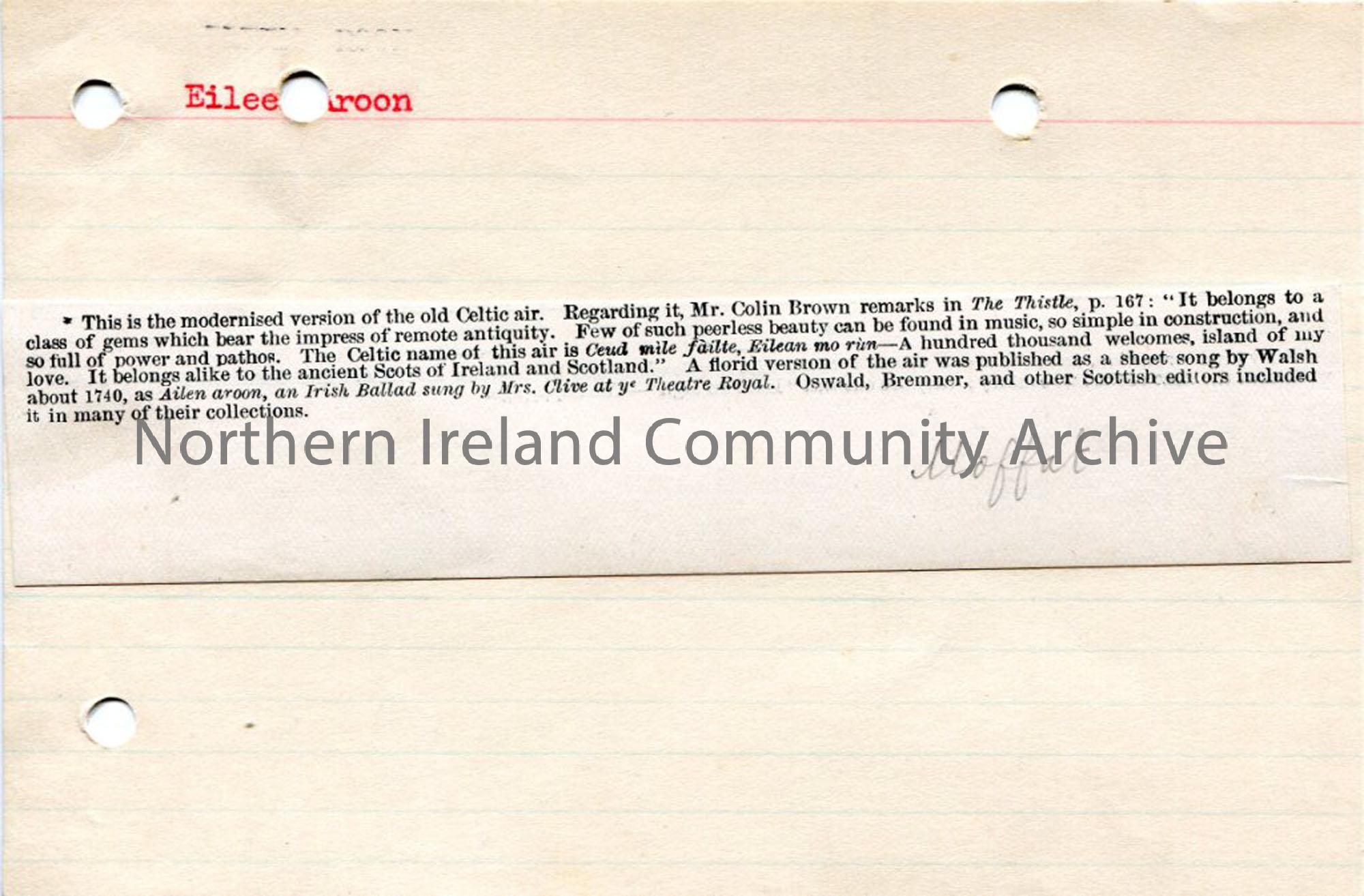Small printed extract affixed to card - information re: a Celtic air found in Scottish and Irish collections.